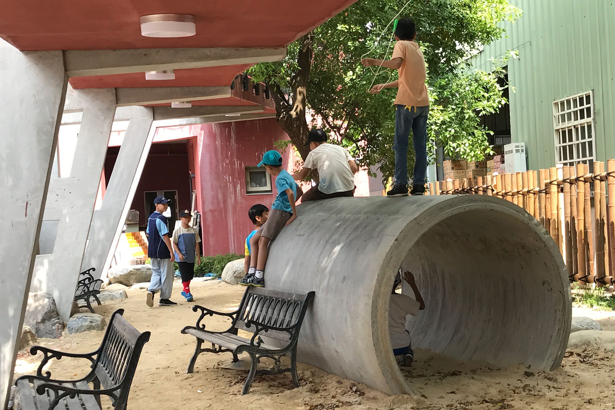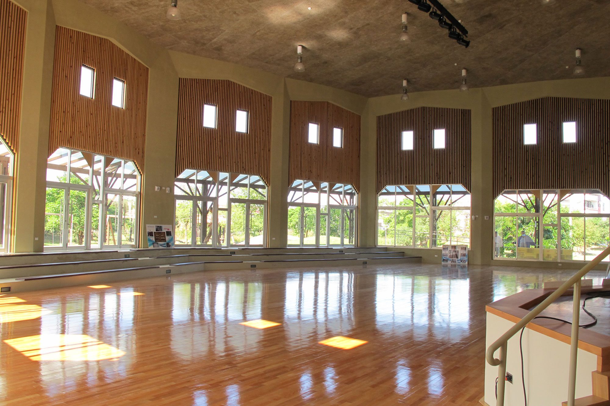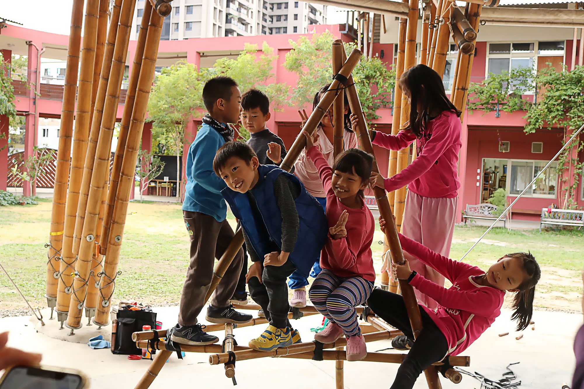 同時,校園開放空間種植草坪和留設生態池,留給學生親近自然的空間。校園核心位置是半戶外竹構多功能教室,做為藝術與音樂課程活動場所,構造上採用和與教室同型式的竹桁架環繞群聚成圓形平面,最高點匯集處是鋼構的通風塔,其上鋪設透明PC板採天光。為延續自然的意象,半戶外多功能教室基礎使用溪石,將竹接頭的螺桿植筋到溪石裡。學校在這多功能空間掛上手染布,風吹撫著掛布,光影半透,這個多功能教室是目前學校最受歡迎的空間!