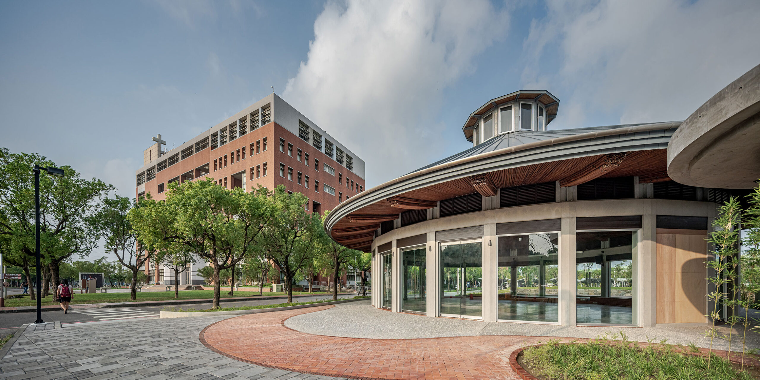 微笑餐廳則是以傘狀的幾何形體作為概念發想,利用竹材可以彎曲及張力特性,以孟宗竹材上下兩層斜向交疊,形成編織交錯的屋架結構,展現竹子優異的韌性,也希望盡量降低建築量體對於景觀視野的阻礙,同時提供足夠的室內空間。