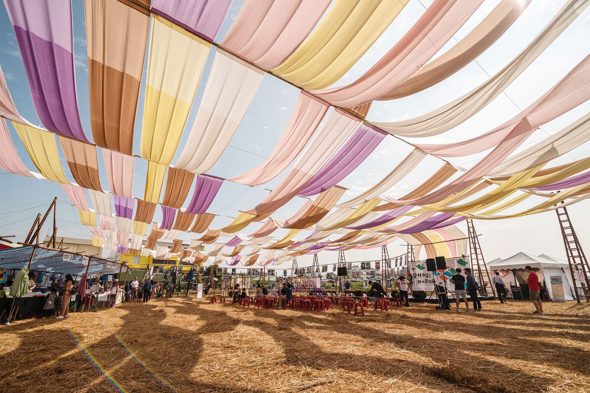 《低碳行動概念竹墟》透過熟悉的生活元素── 毛巾、竹樓梯構築大尺度的開放場域,外部環境以農耕地景為基…