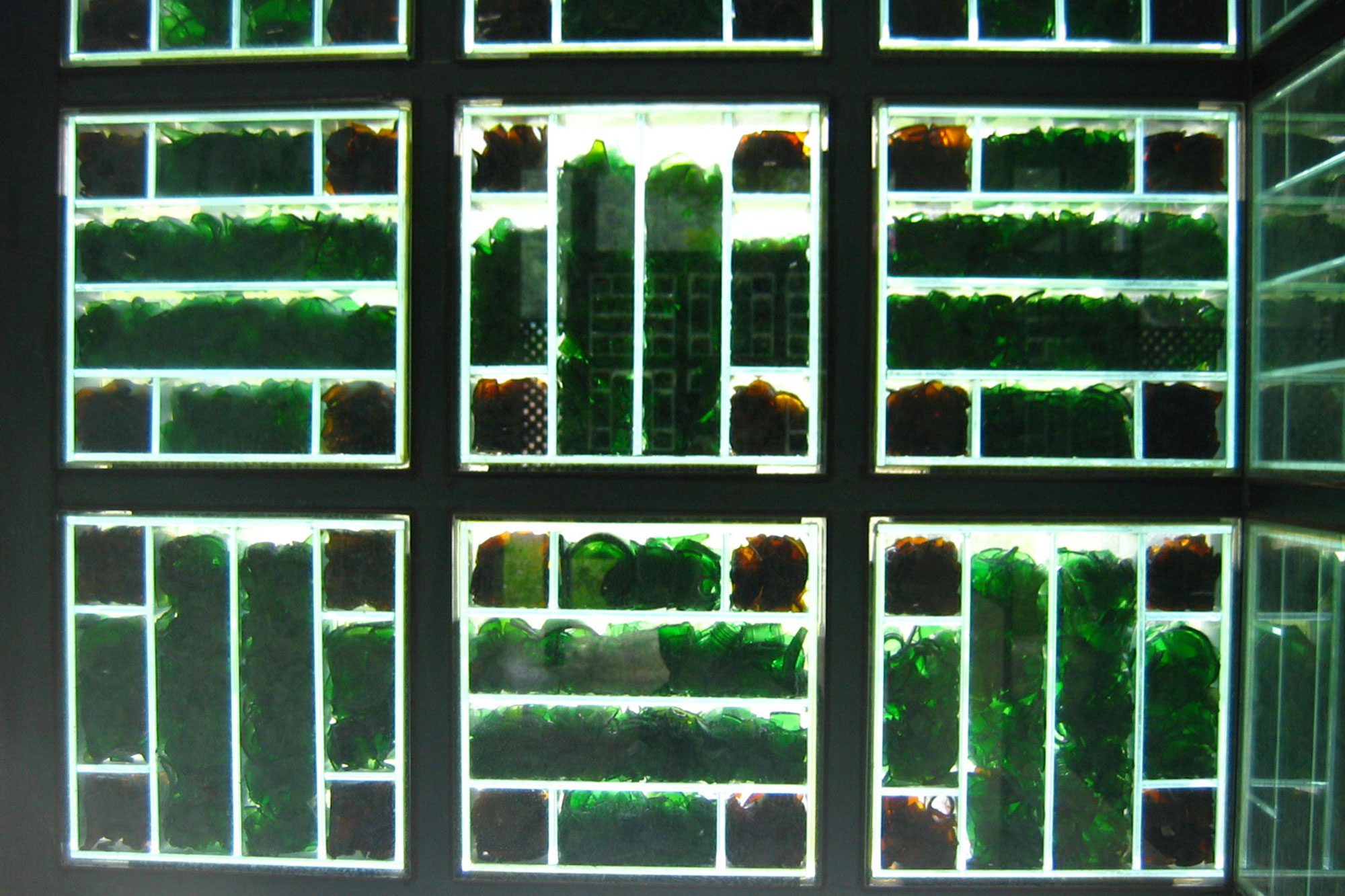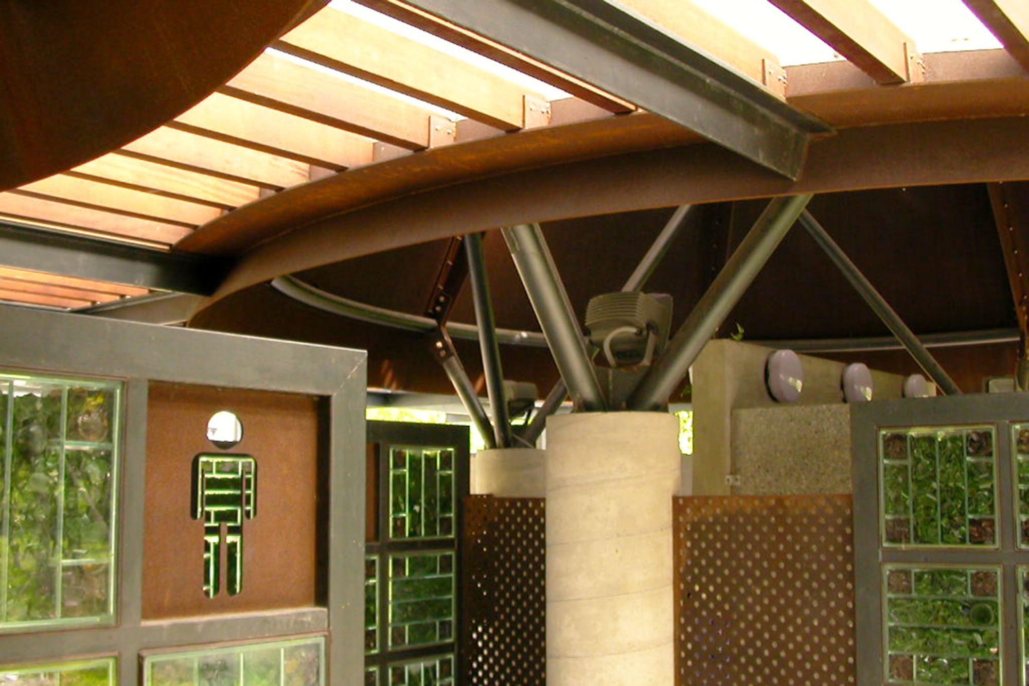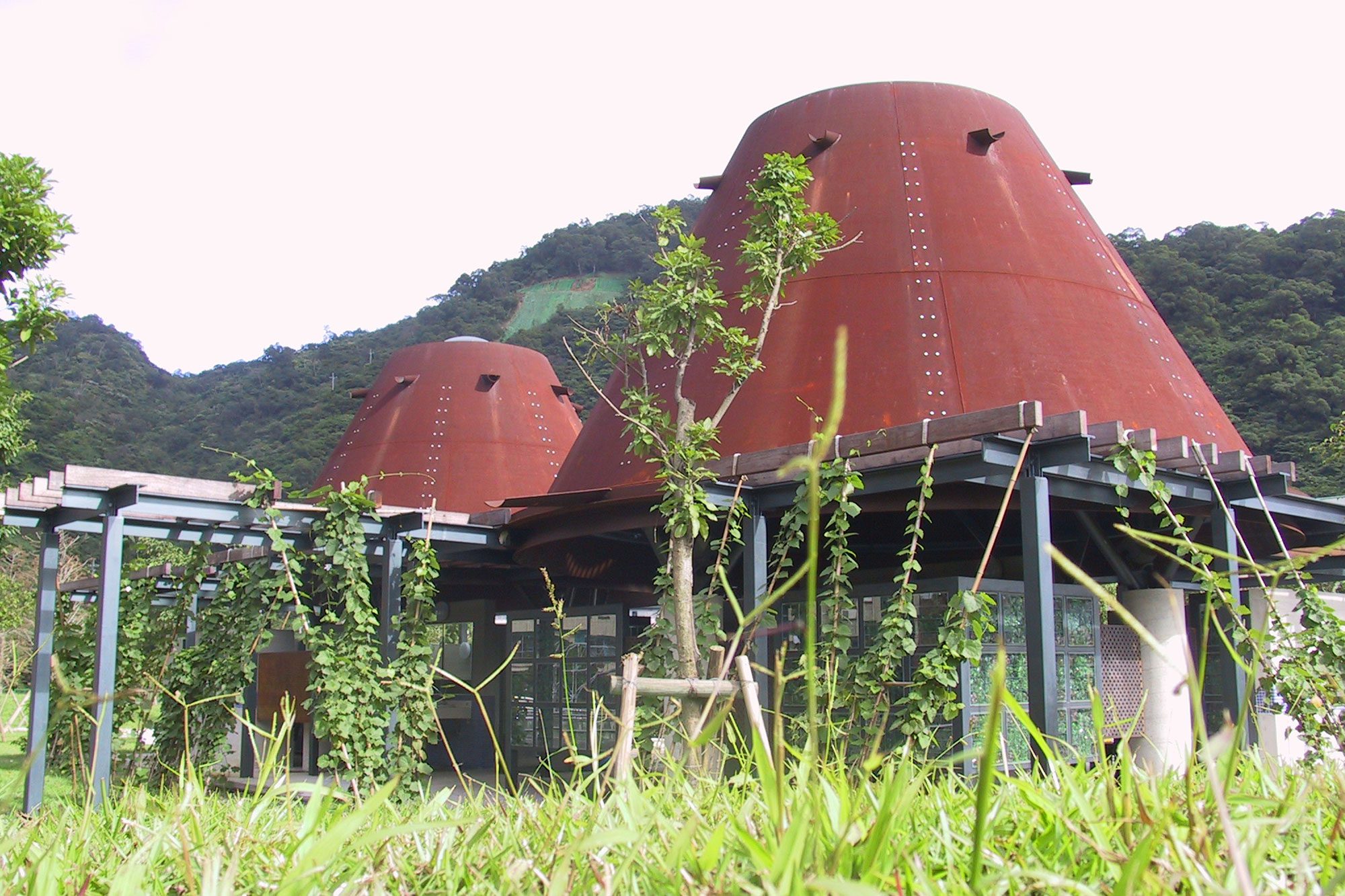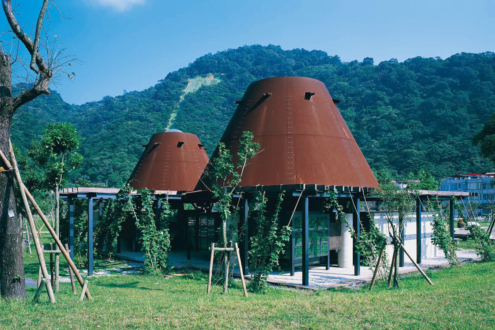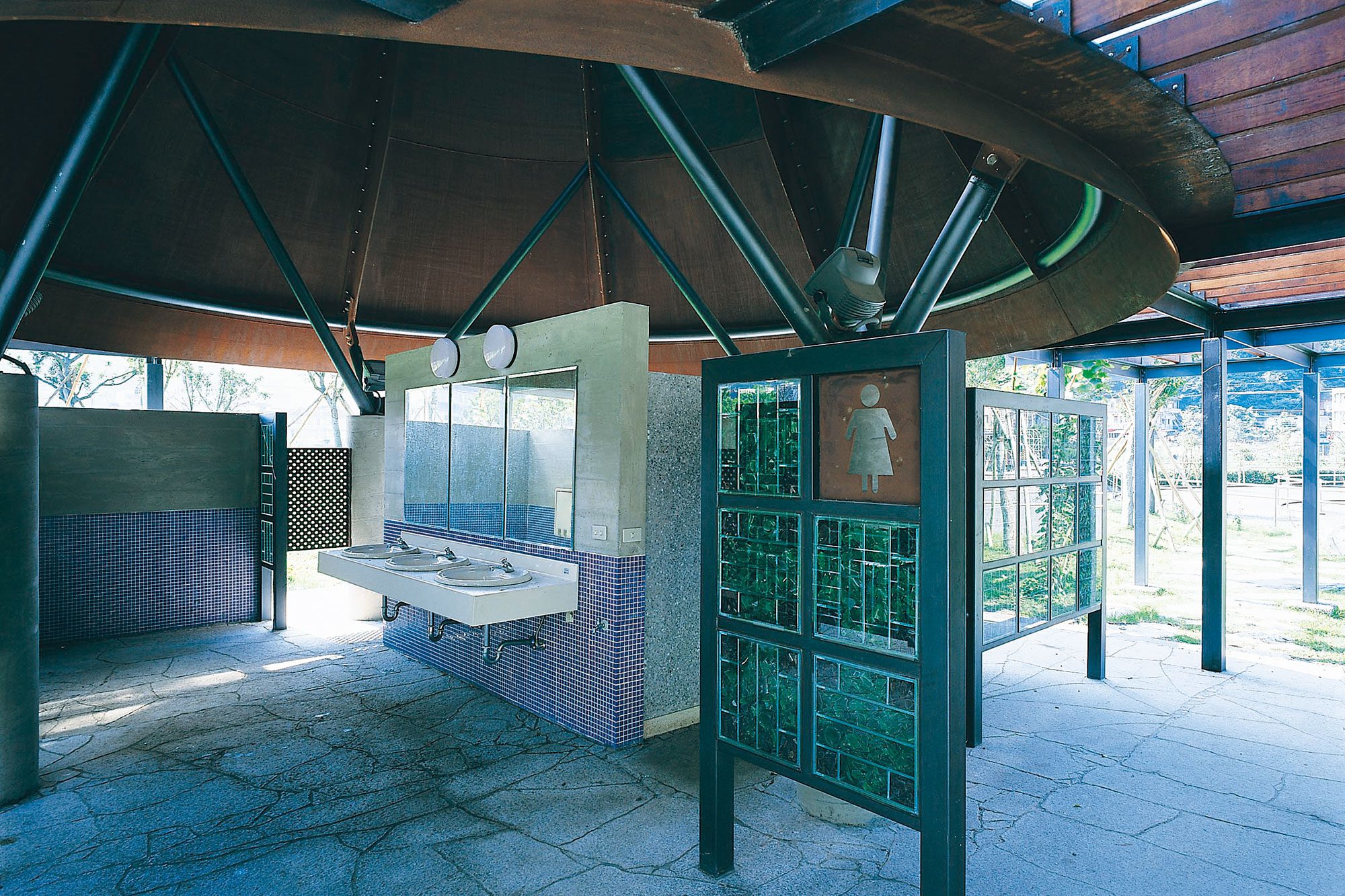 蘇澳冷泉特殊的地理環境,是本案創意的靈感來源,鐵鏽色的冷泉浴池、彈珠汽水、石灰岩等意象,以及群山包被的基地地景,讓二座耐候鋼小丘造型的外觀呼之欲出,輔以彈珠汽水空瓶做出的玻璃磚,作為主要牆面材料,於是產生這座非常有趣的公共廁所空間。