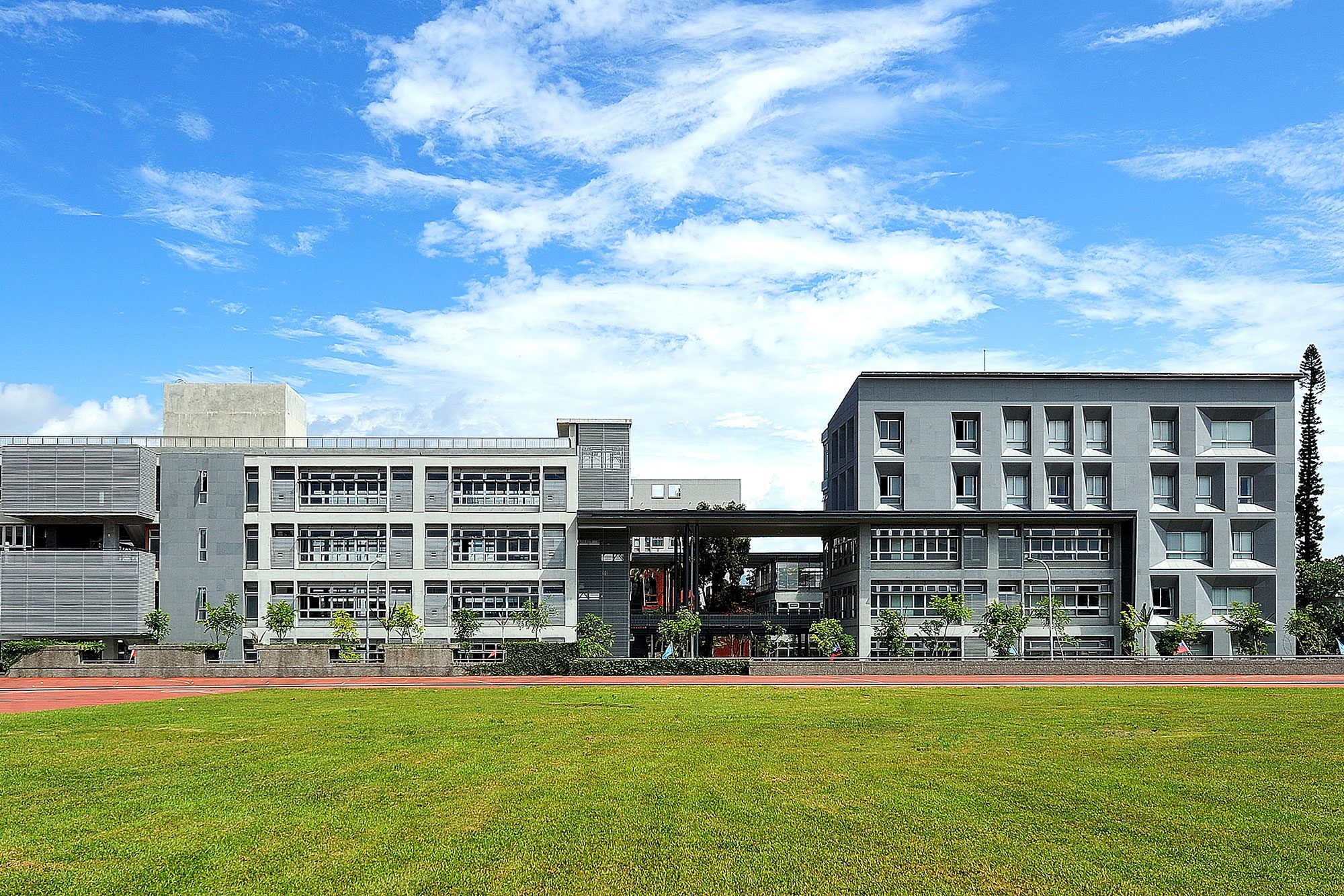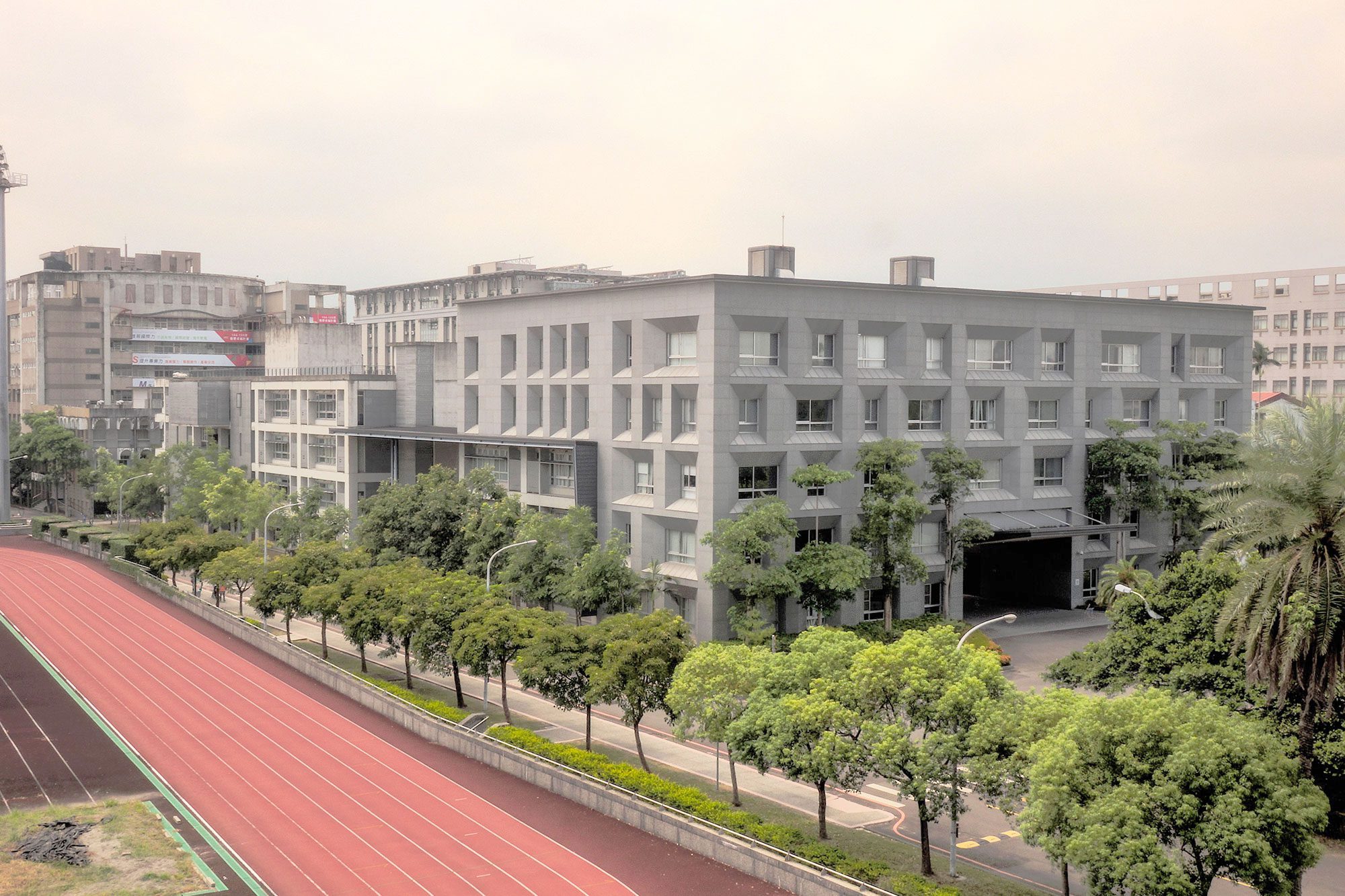 讓綜合教學大樓成為校園的核心,ㄇ字型的配置形成院落空間,正立面回應入口中軸線及南洋杉,形成門戶上的新意象,南北兩翼四至五層的量體延展出沿街面的小城尺度,留下四周成列的小葉欖仁,結合人行系統形成林蔭步道。