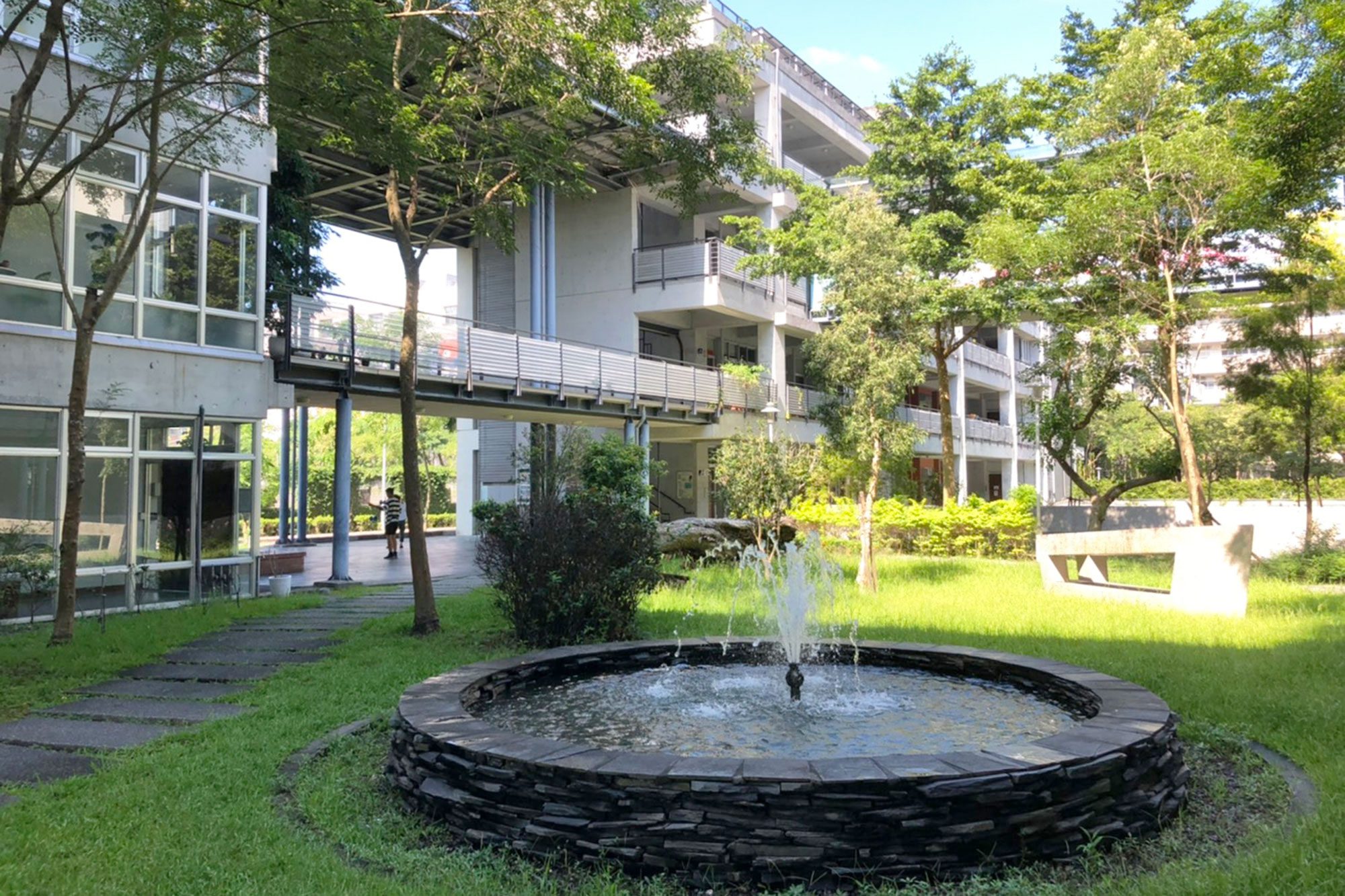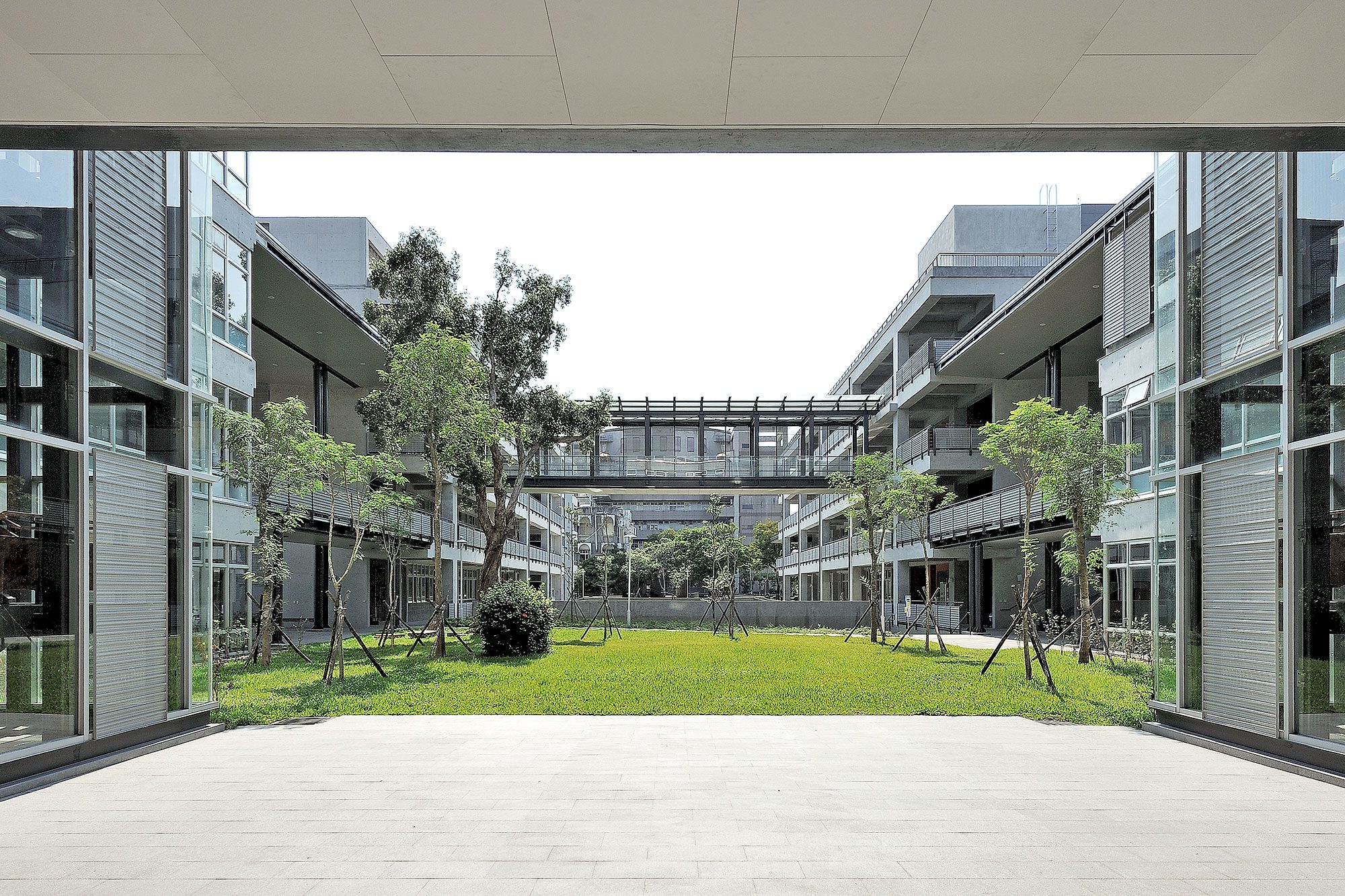 新合院延續宜大在農校時期的配置精神,使院落空間成為校園的核心,且扣合校園的中軸線,院落型態原地保留代表校園歷史的白千層老樹,架構上也連接未來南北向的開放空間綠軸,讓學生可以在具有層次變化的院落裡活動或停駐,成為交流互動的合適場所,提升綜合教學大樓的全校共享價值。