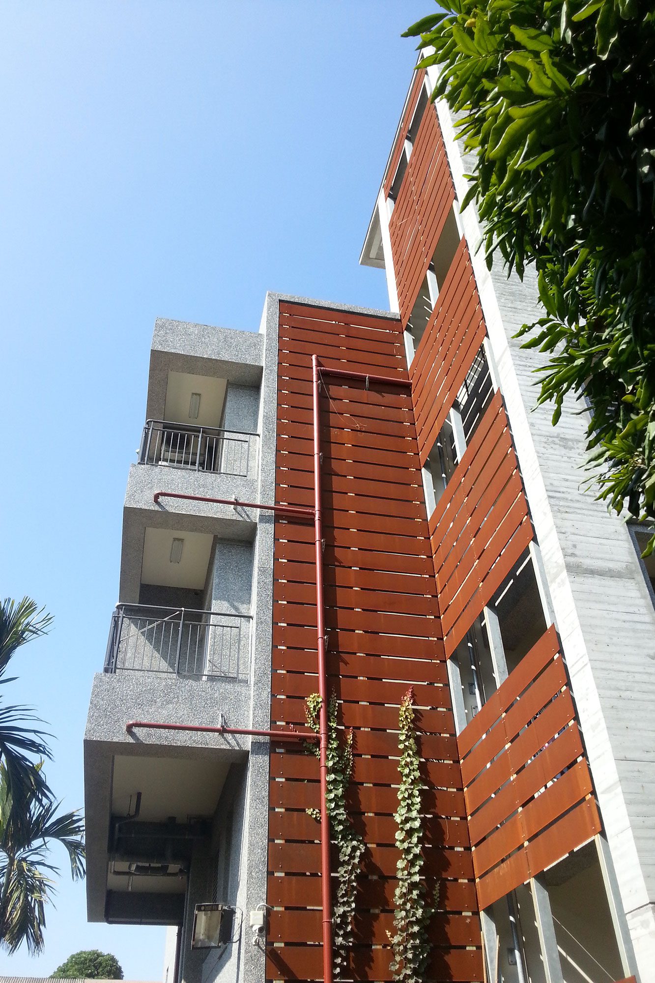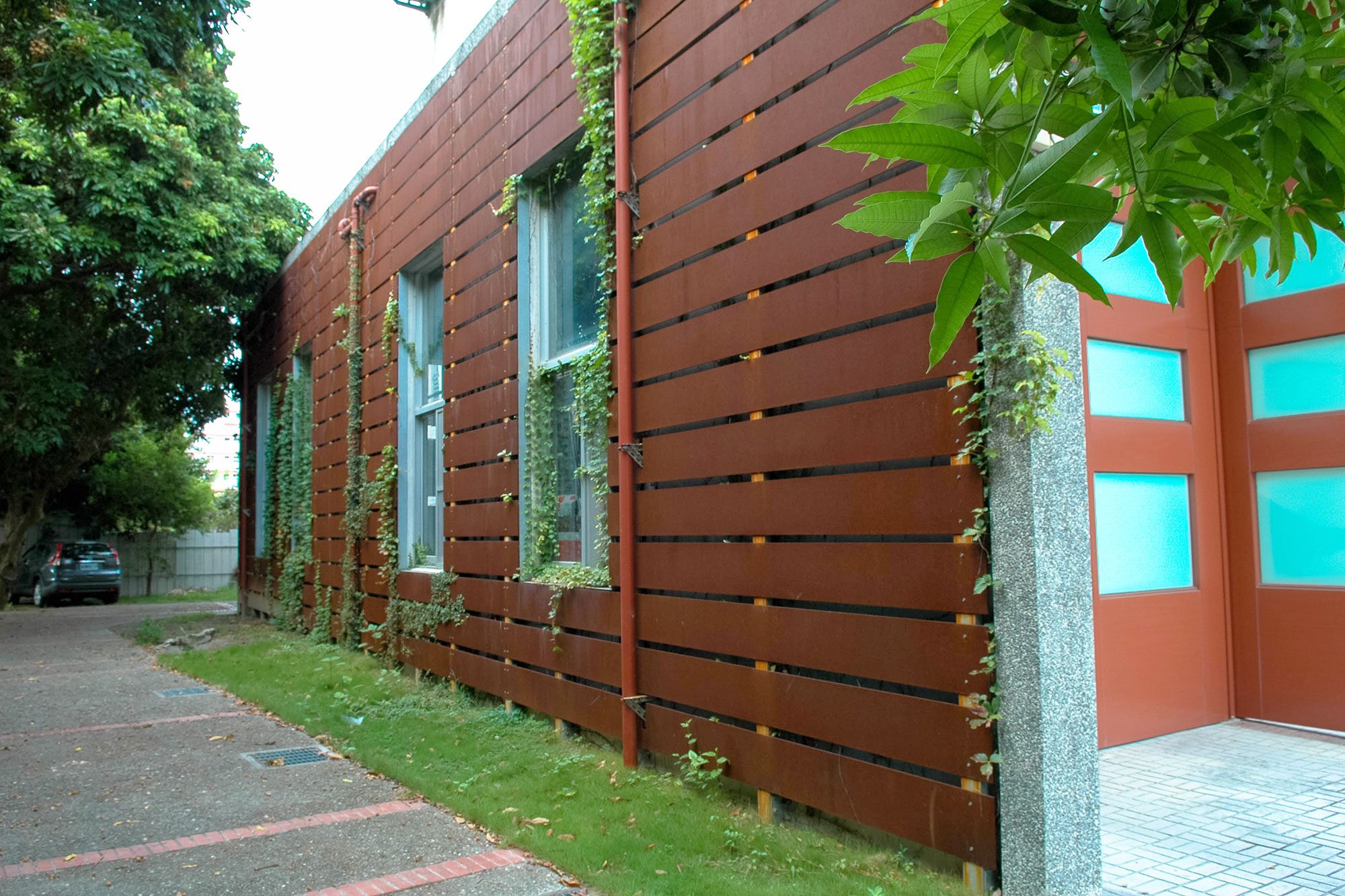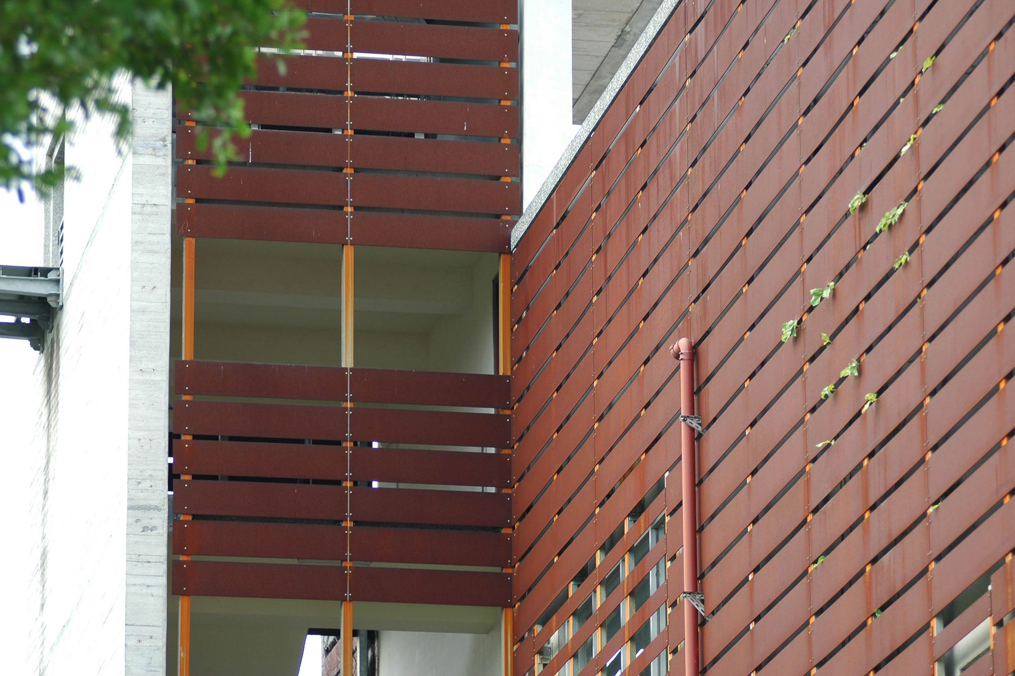 消防隊是機能明晰的公共設施,一樓需有足夠停放消防車的車庫空間,以及順暢的進出動線,車庫上方則是辦公室、住宿等後勤空間。我們賦予西螺消防隊簡潔明晰的造型,材料選擇耐候鋼,自然呈現紅色系的穩定色彩,為了增加遮陽效果,設計讓東西曬陽光不要直射牆面,車庫入口因面朝北方,為防北風及揚塵,則設計可以完全開合的大門。