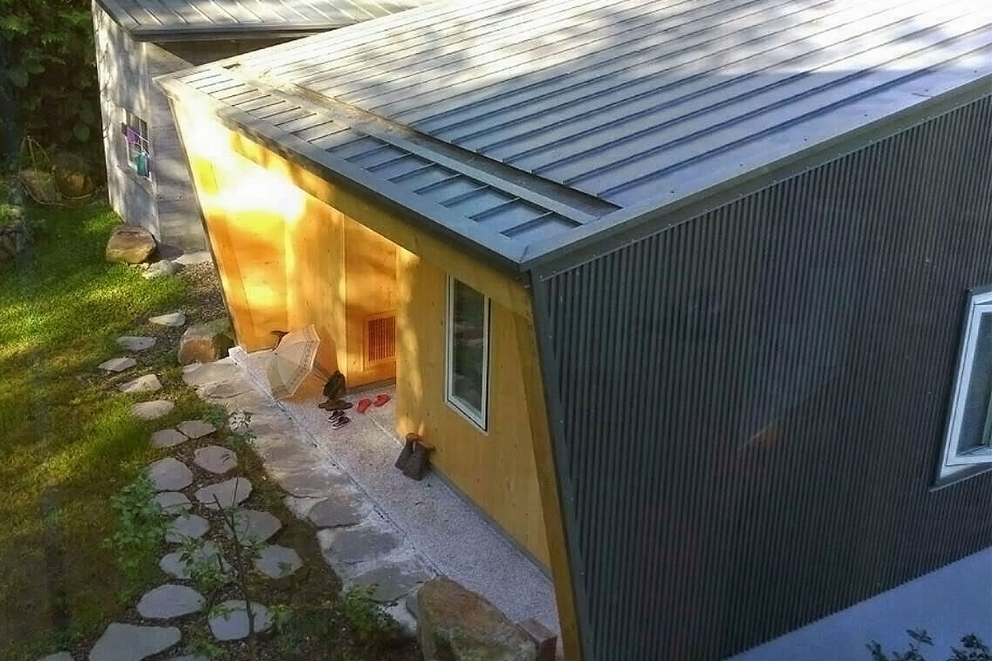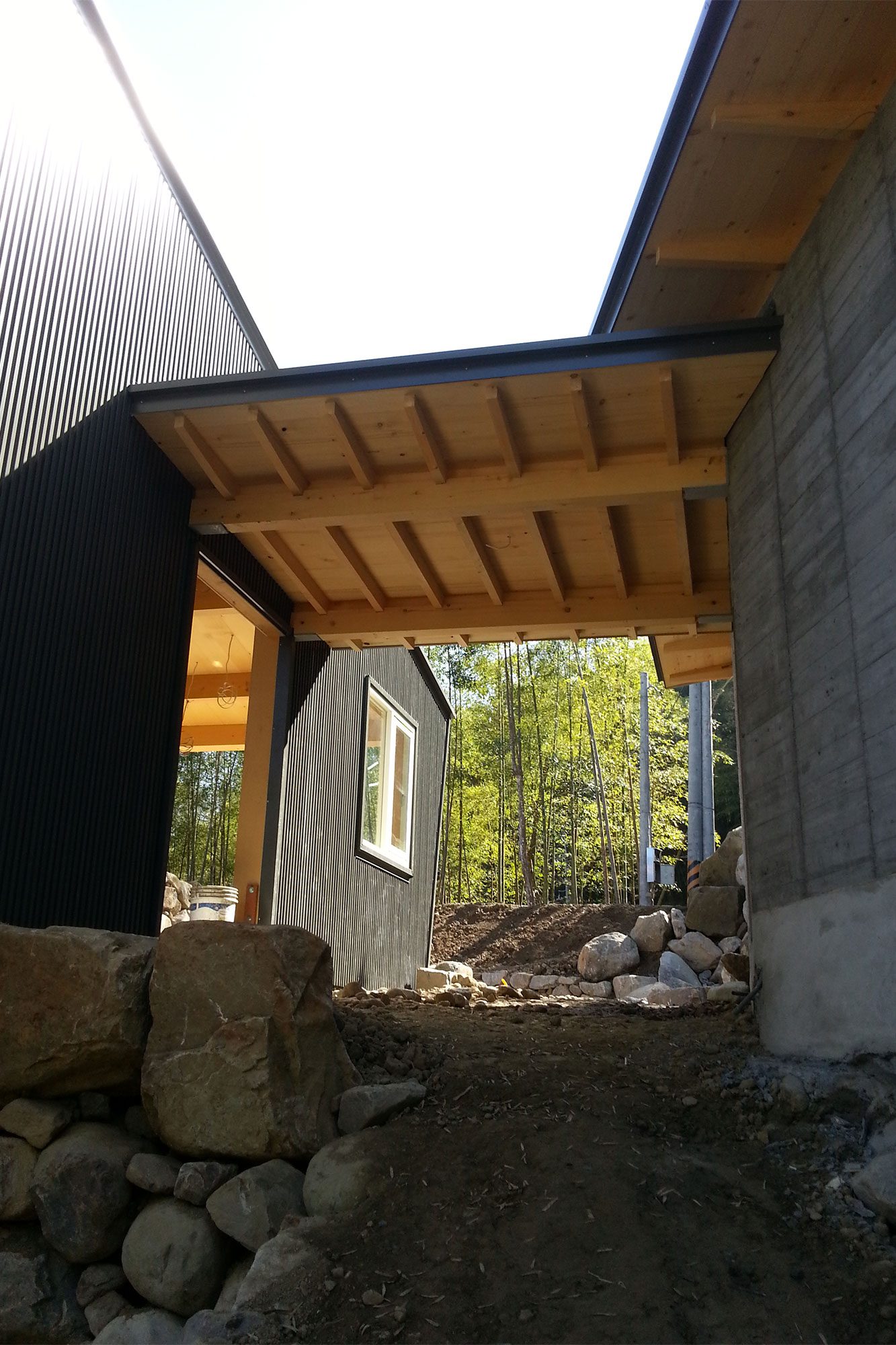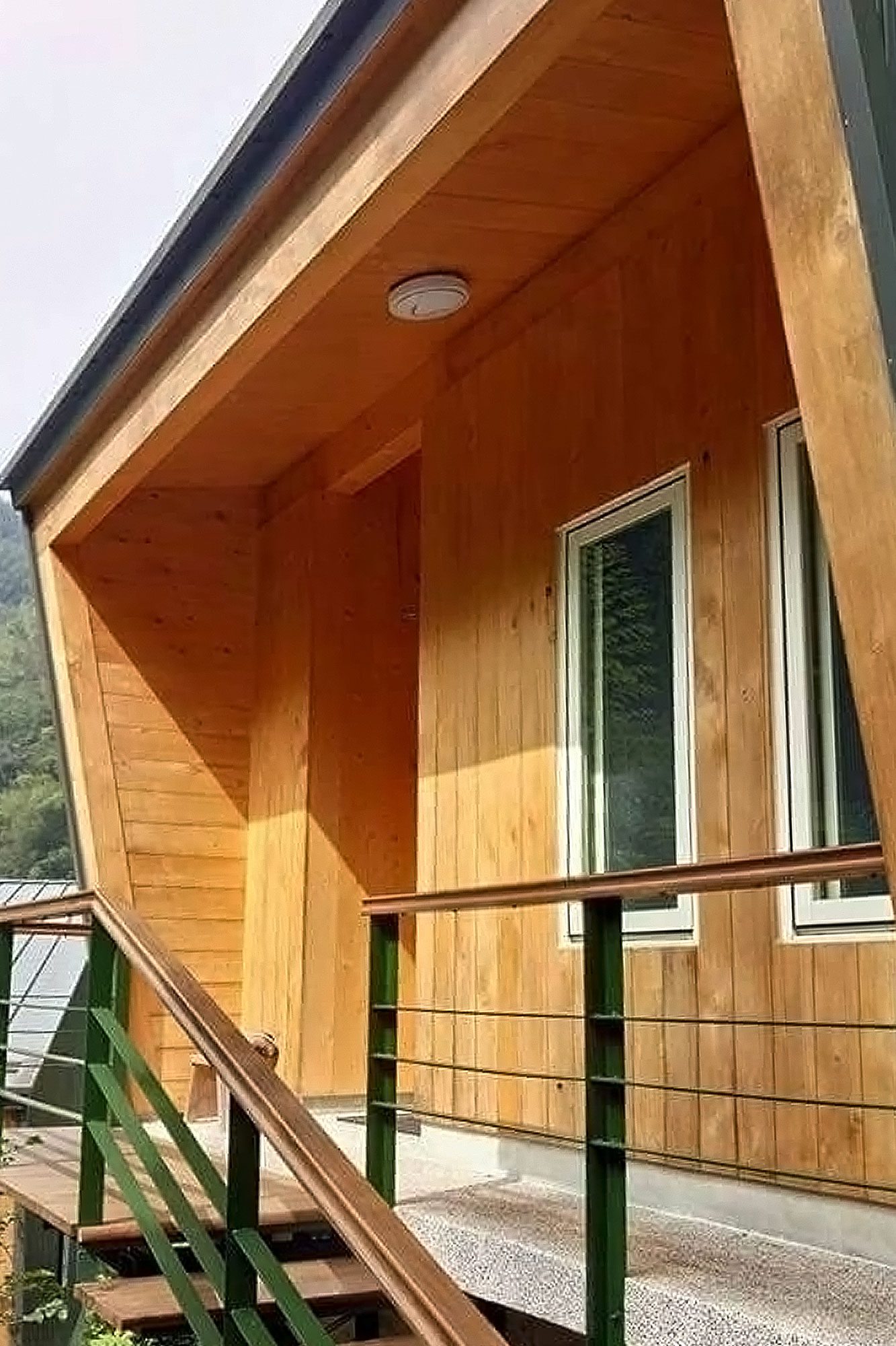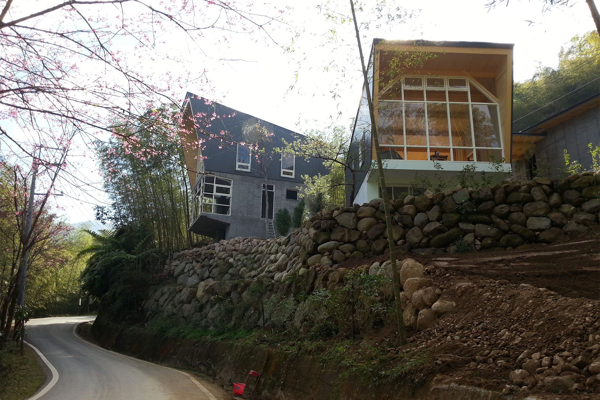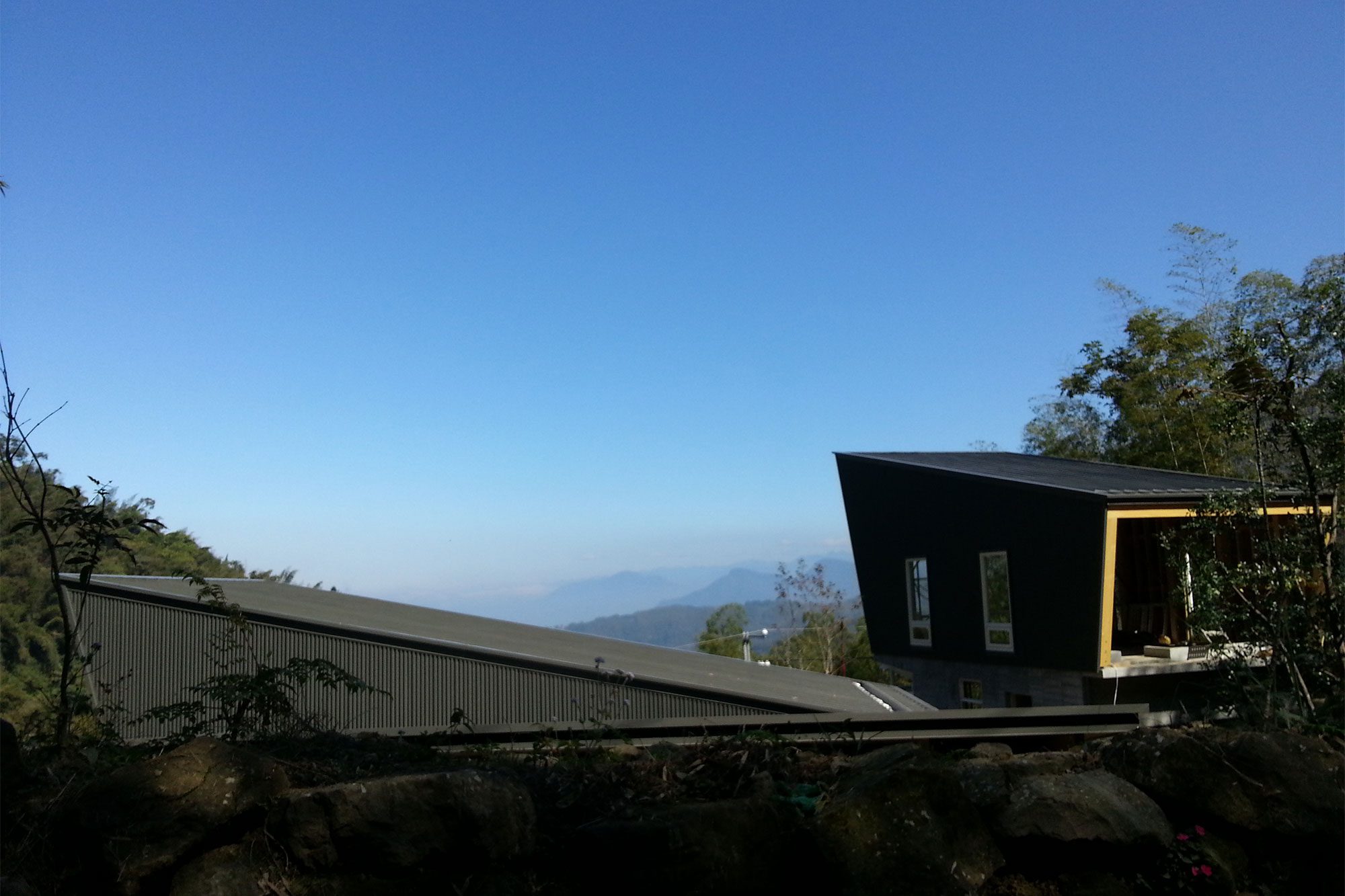 基地是一塊地形多變的山坡地,我們希望塑造輕巧的山中小屋意象,構造上採用R.C.加木構,R.C.重構造貼緊大地,兼作擋土牆,並以就地取材的石塊砌成石牆,呈現粗獷的大地感,輕巧的木構單斜屋頂朝向遠山,像是山林中正在遠眺的小精靈。