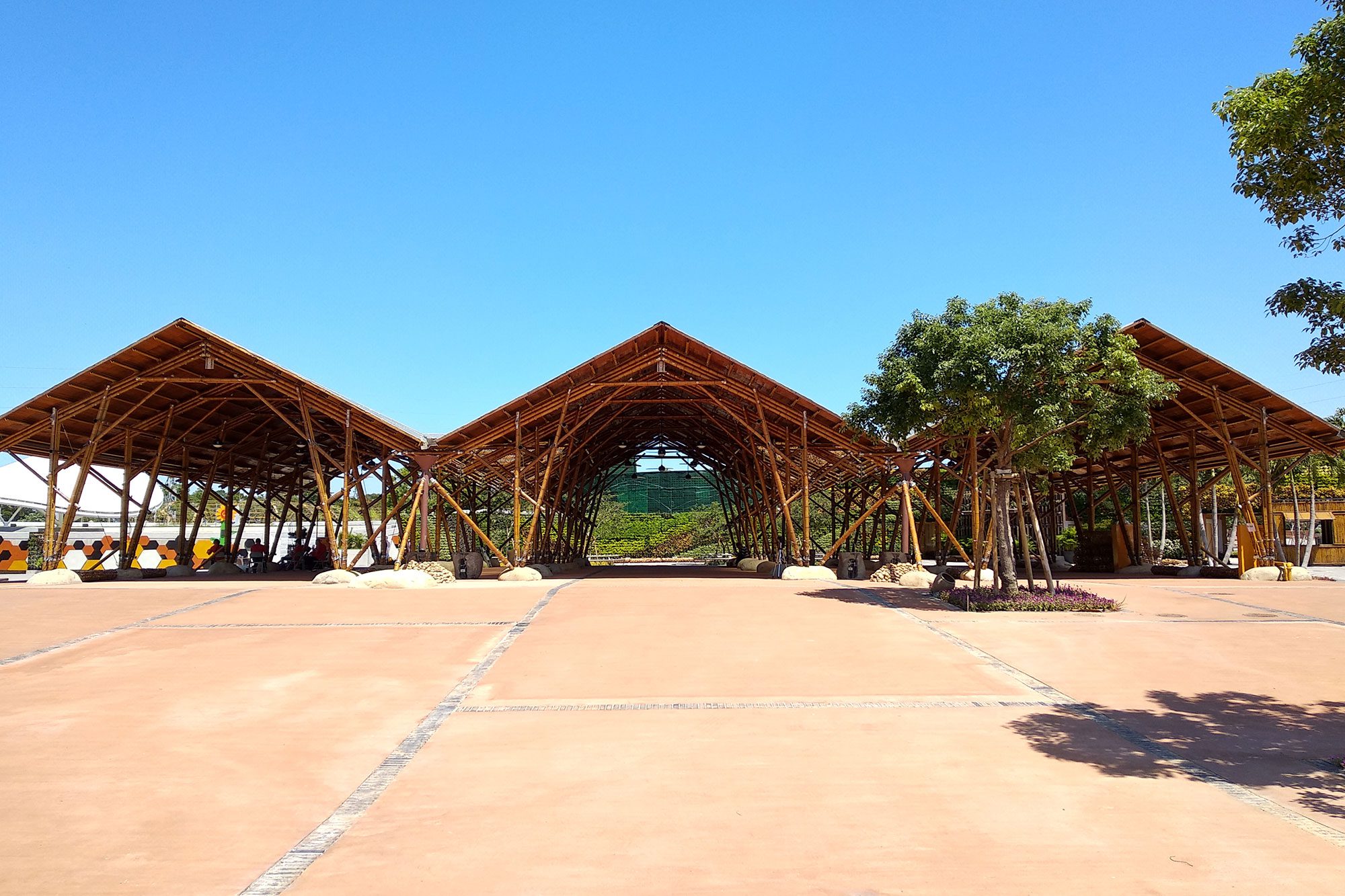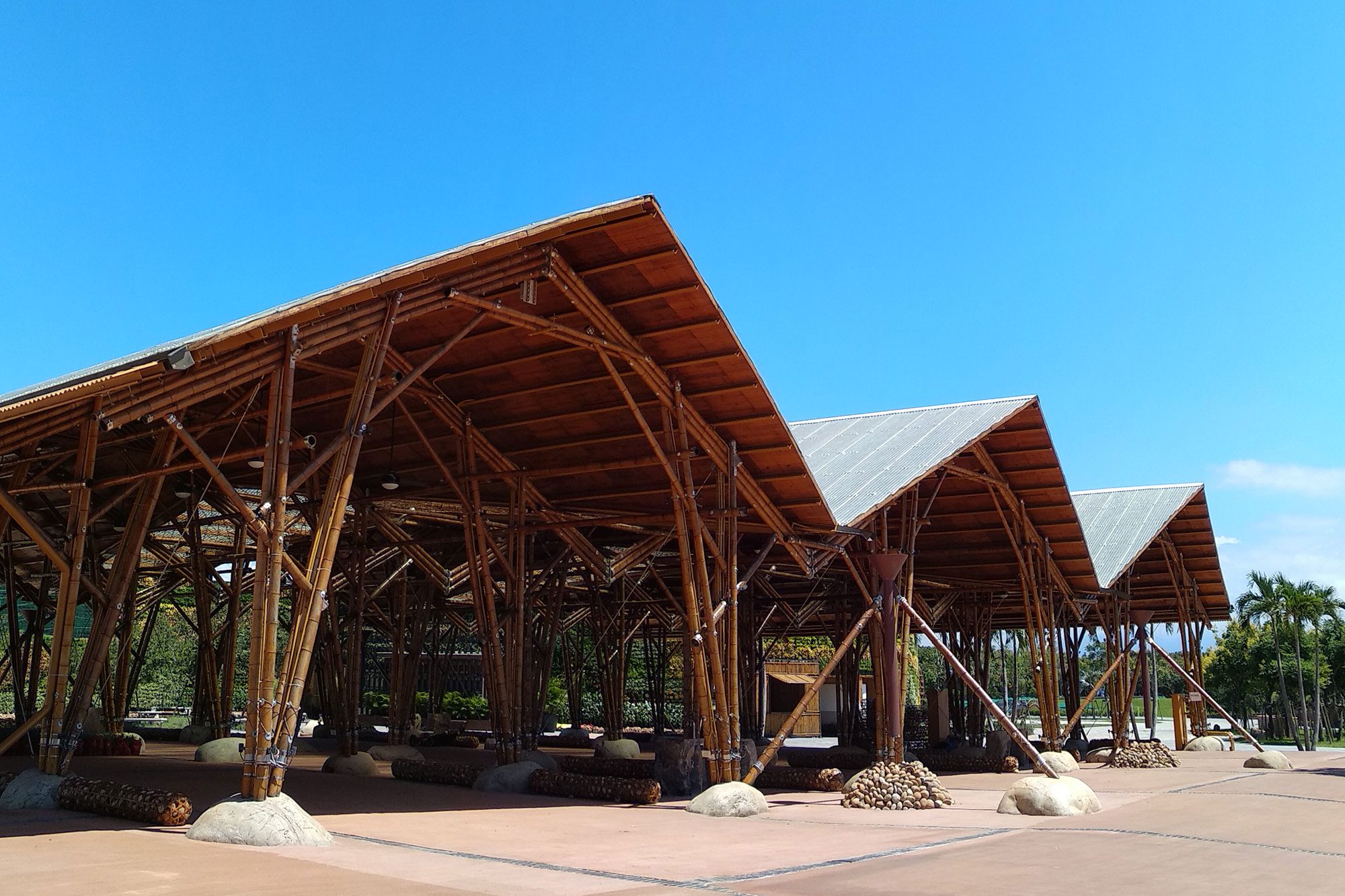 2018台中花博,外埔園區核心理念是綠色生產,大藏在這裡設計了一座竹建築,花博期間作為販賣輕食餐點使用。基地東北邊面向活動廣場,西邊銜接停車場與廁所等服務性設施,南邊則是提供遊客休息用餐的戶外廣場。為了使遊客可以自由地穿梭園區,我們設計一個自由開放的平面,迎接來自園區各處的遊客駐足遮蔭。
