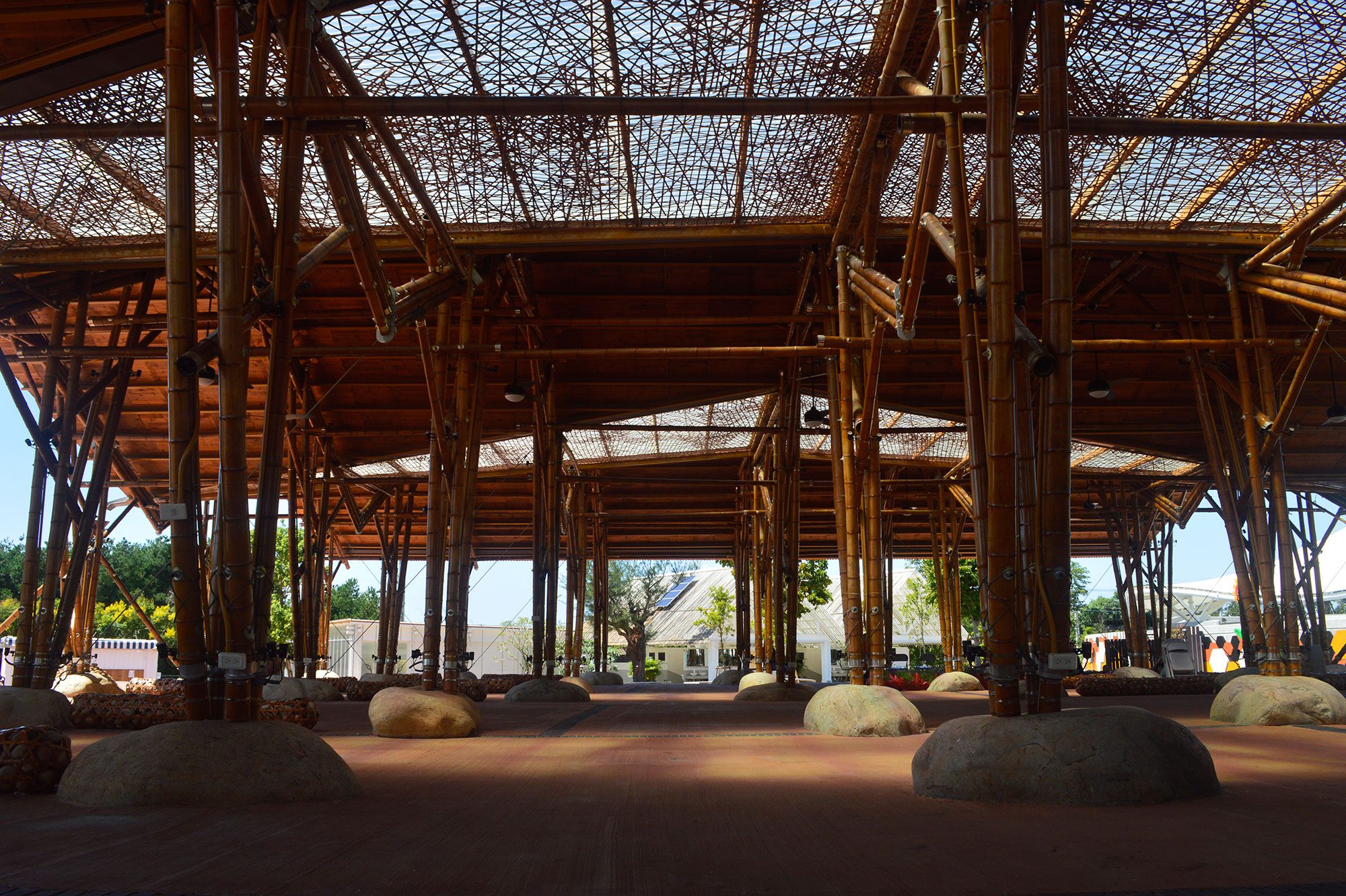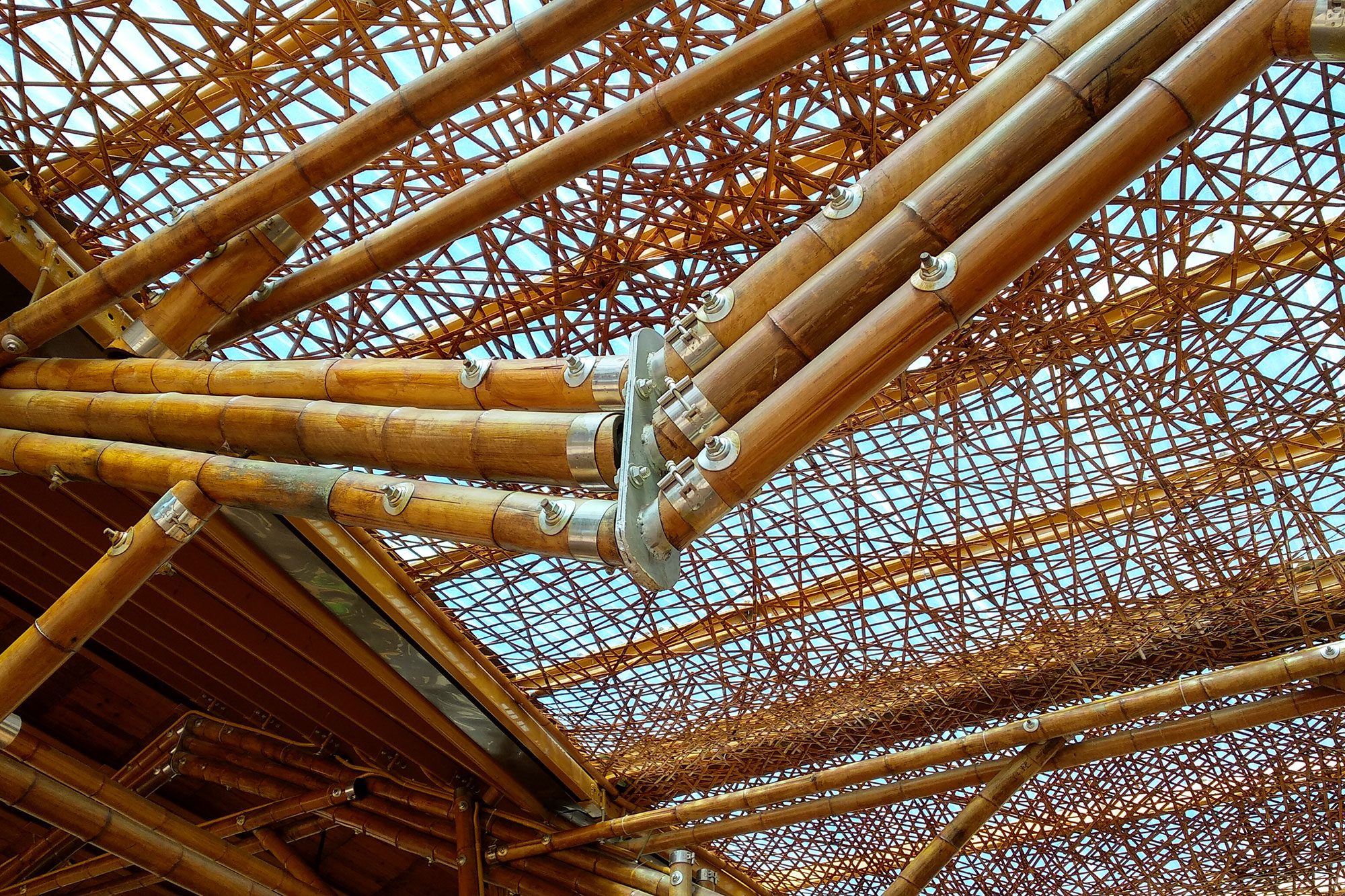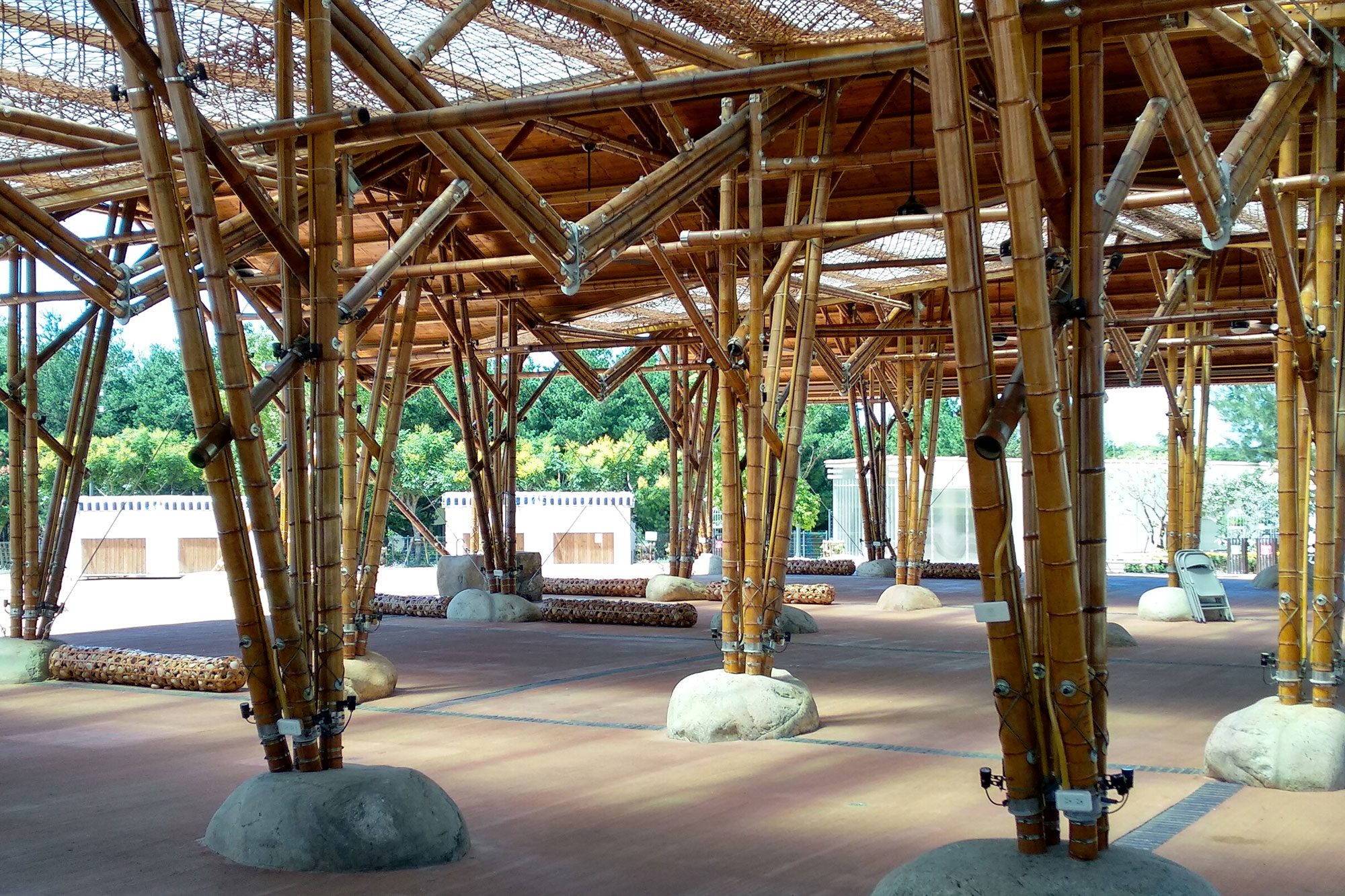 三座竹桁架的交接處結合天溝將雨水引導至兩端的卵石堆,創造竹與石自然材料的交流。竹構築的基礎也不使用混凝土,採用來自台中大甲的溪石做為基石,呼應自然的竹建築,與土地更為貼近。