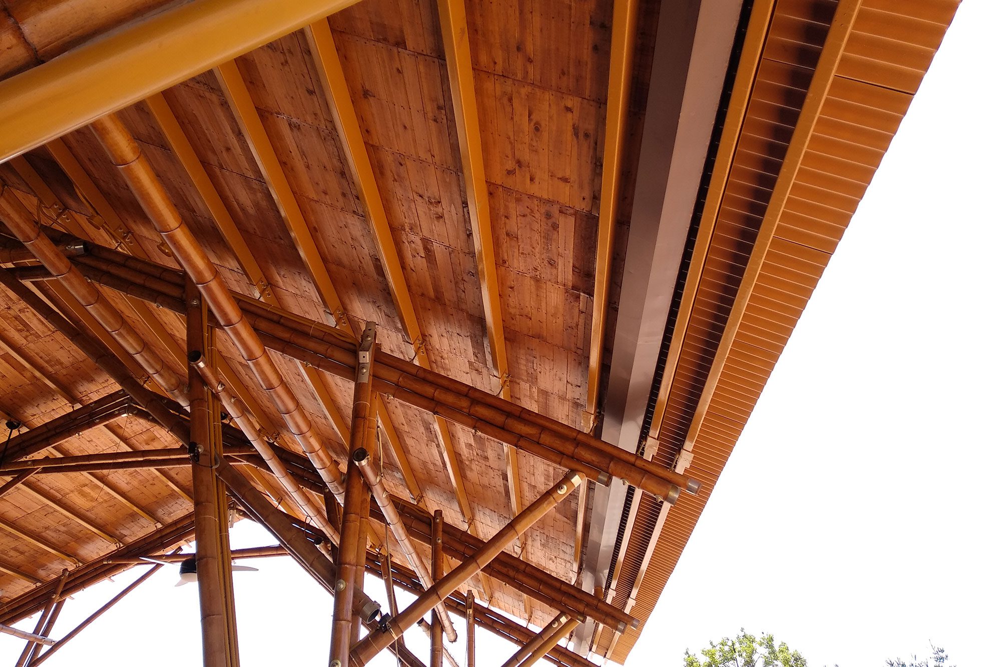 設計造型上採用並排三座竹棚,呼應周圍淺山地景。竹子強韌的縱向纖維以及中空有節的特性,非常適合成為只承受軸力的桁架系統,我們設計一款簡單的竹桁架,主要是以孟宗竹組構而成。屋頂使用透明PC浪板,浪板下大部分為杉木模板提供大面積的遮蔭;桁架交接處的屋面在透明PC浪板下固定竹編天花,創造樹蔭般的織理,虛實天花板交錯配置,營造光影交輝的趣味。