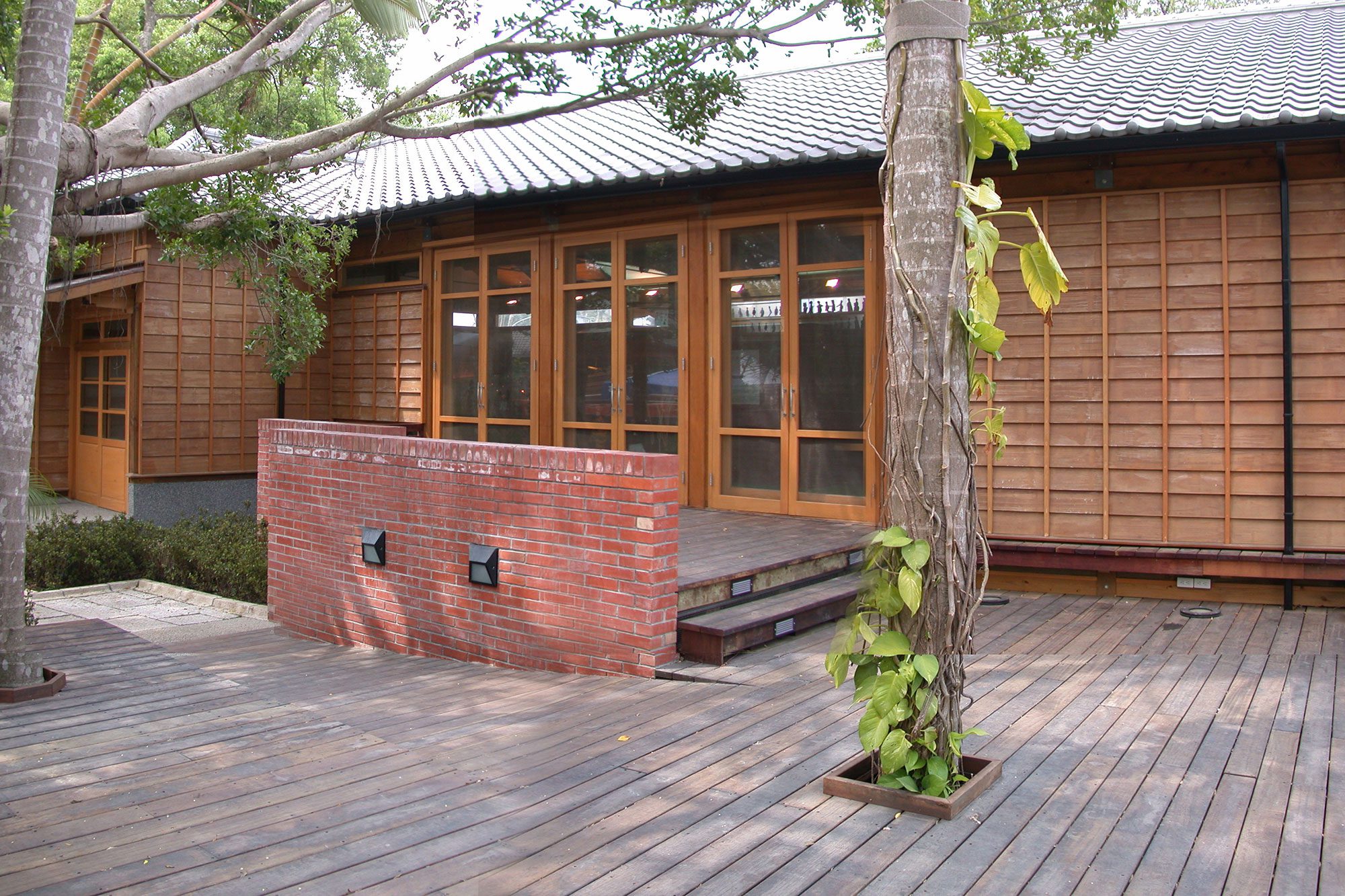 原有校舍歷經多次興建增改建,外牆有二丁掛等各色磁磚,校園風貌紛亂。考慮改修經費減省、也減少廢棄物,沒有將原有磁磚打除,採用塗料類重新裝修,暖色系搭配,讓原有暗沈的校舍明亮輕快許多。
