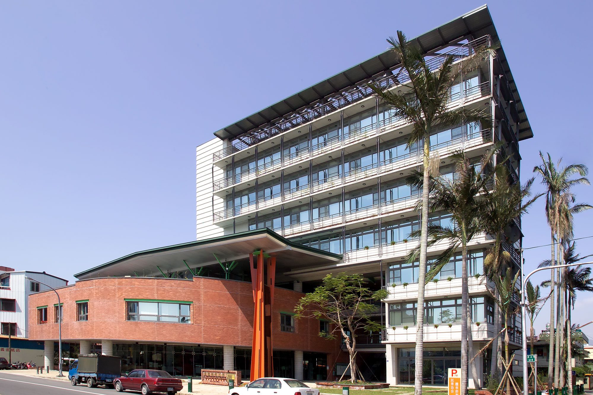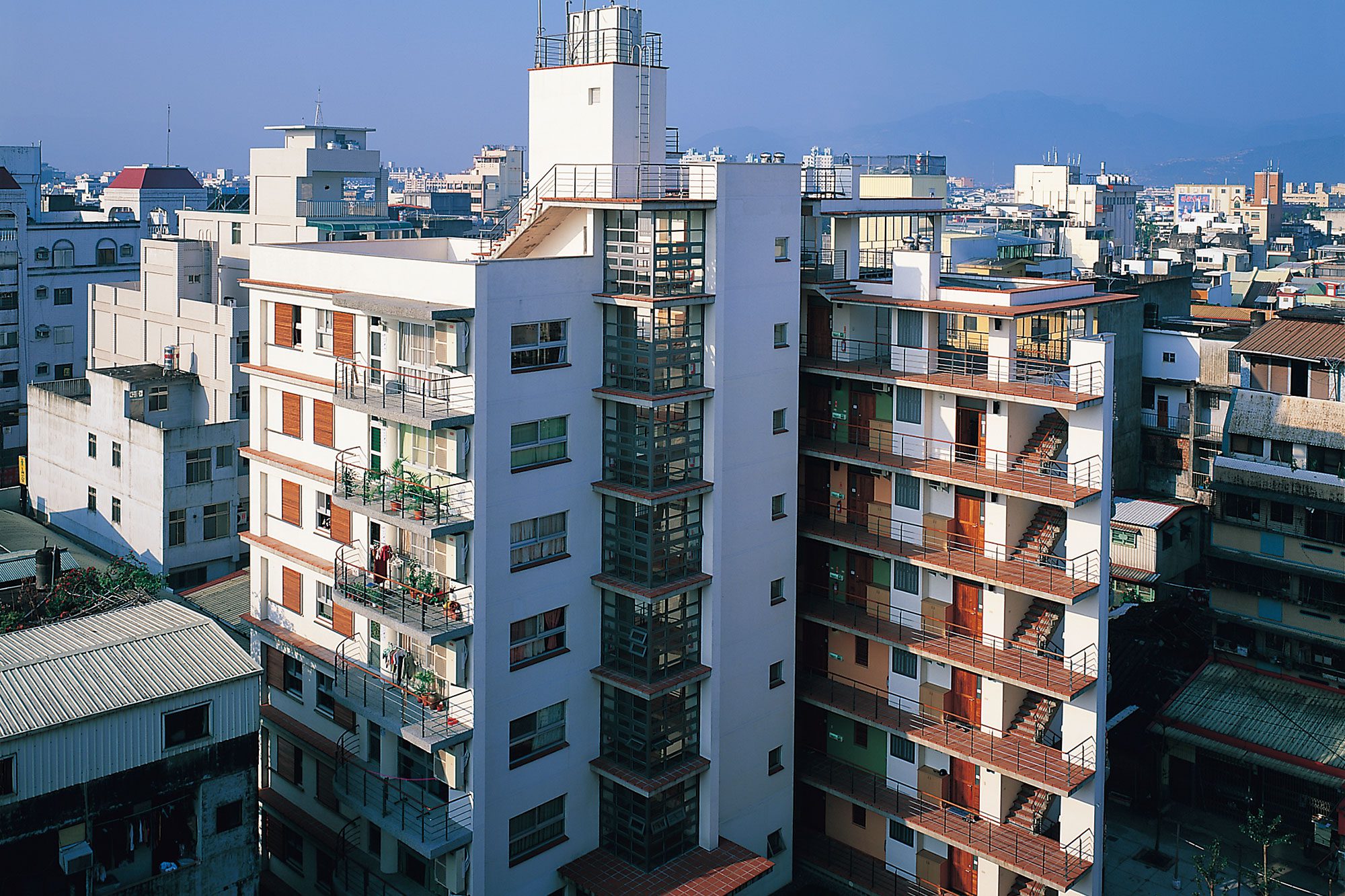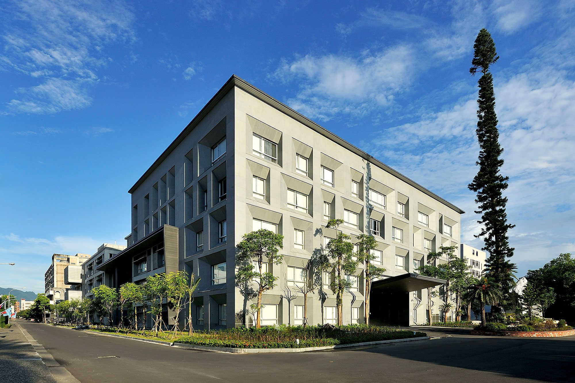 改建後的建築立面透過遮陽沖孔網及格柵系統改善西側及南側日曬問題;屋頂全面重新施作防水隔熱層,更以複層式屋頂隔絕陽光直射、利用風力將屋頂熱能帶走,改善建築外殼隔熱性能。