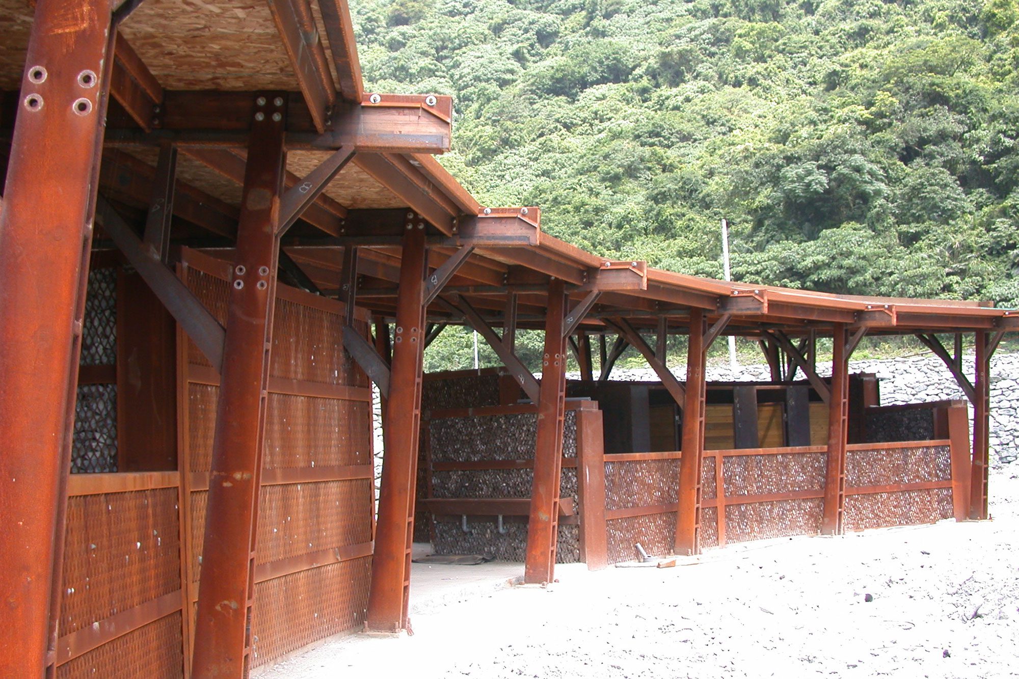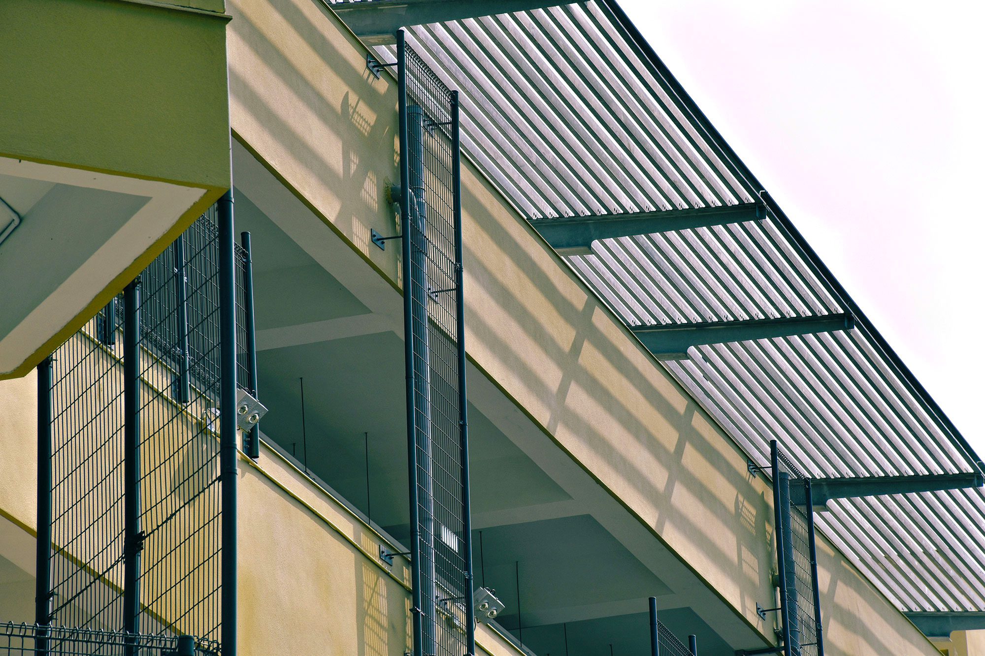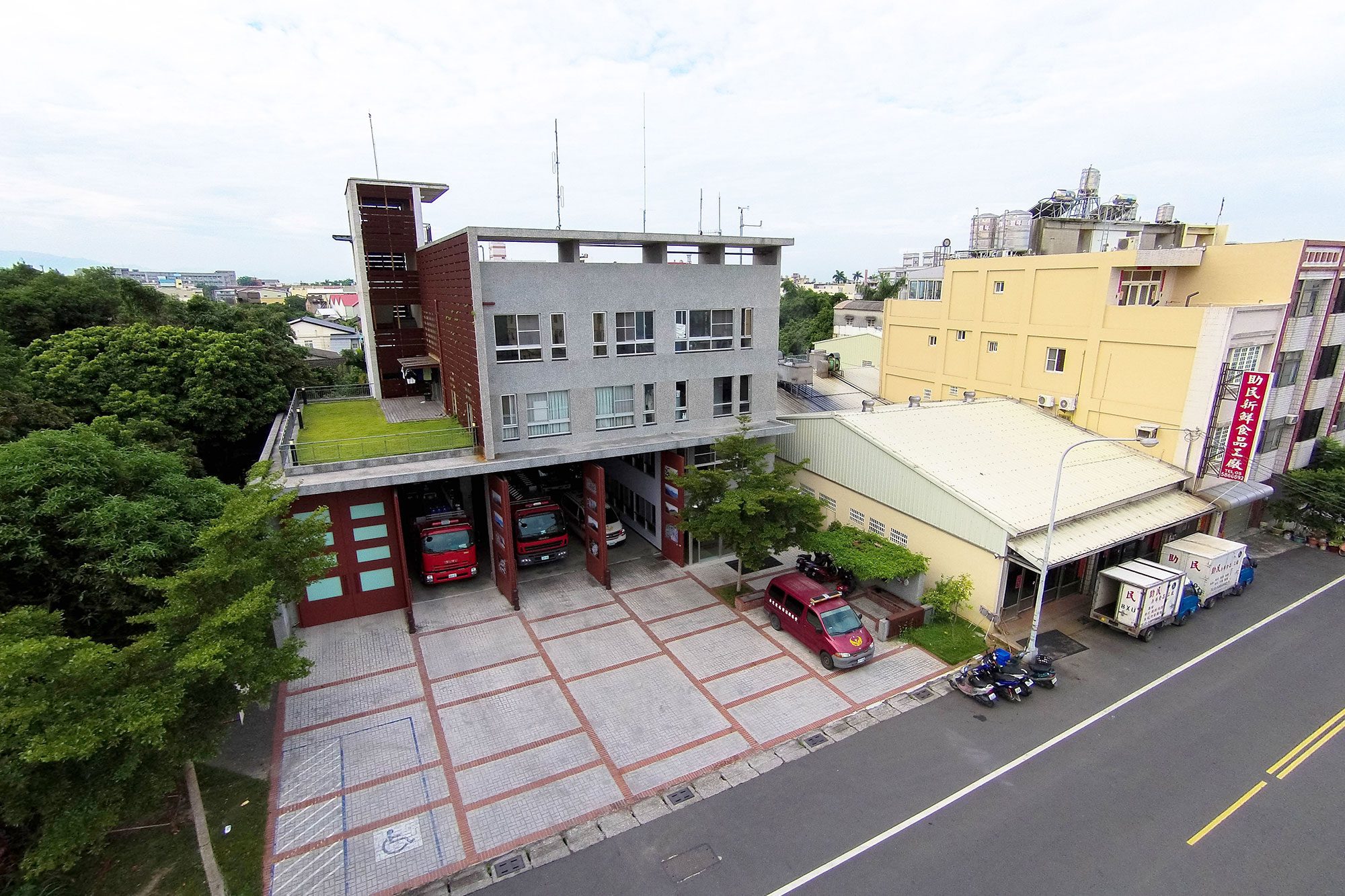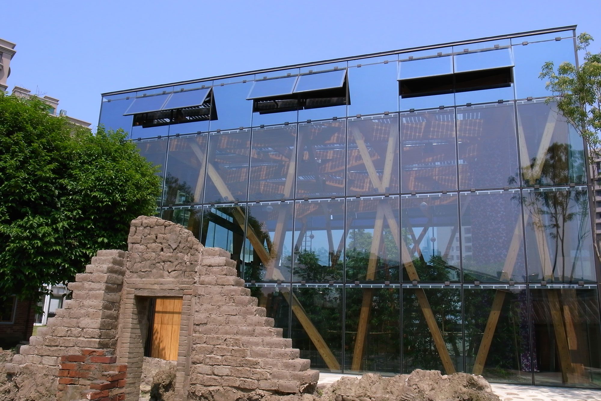 改建後的建築立面透過遮陽沖孔網及格柵系統改善西側及南側日曬問題;屋頂全面重新施作防水隔熱層,更以複層式屋頂隔絕陽光直射、利用風力將屋頂熱能帶走,改善建築外殼隔熱性能。