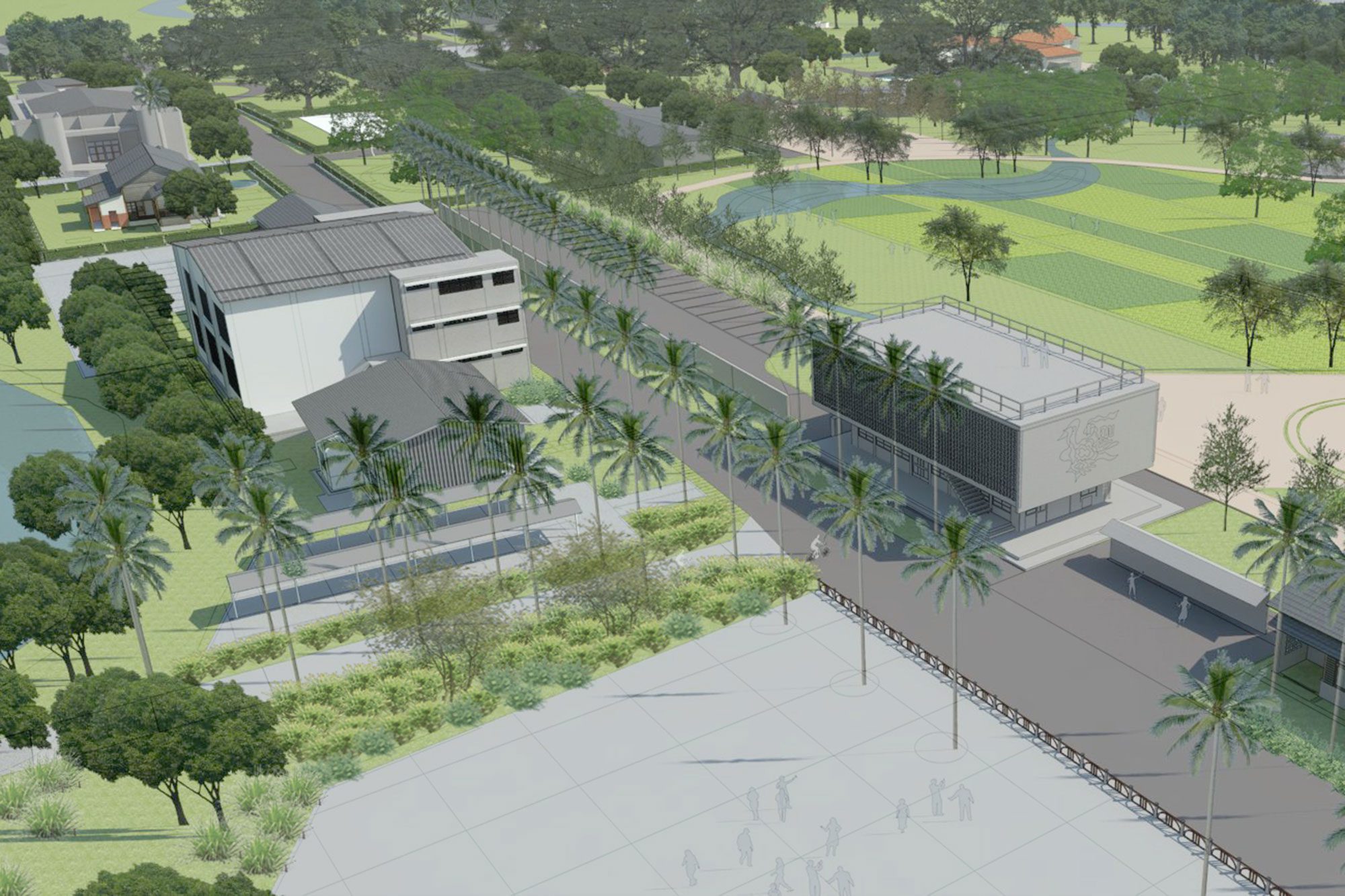原有東勢高工建築密度很高,為改善既有建築量體與造型使與周邊環境協調,建議將既有建築科南棟拆除,釋放出更多的戶外空間,營造校園南側入口;並將北棟拆除第四層降低為三層樓,透過減量方式減少結構荷重,校園環境較為舒爽。