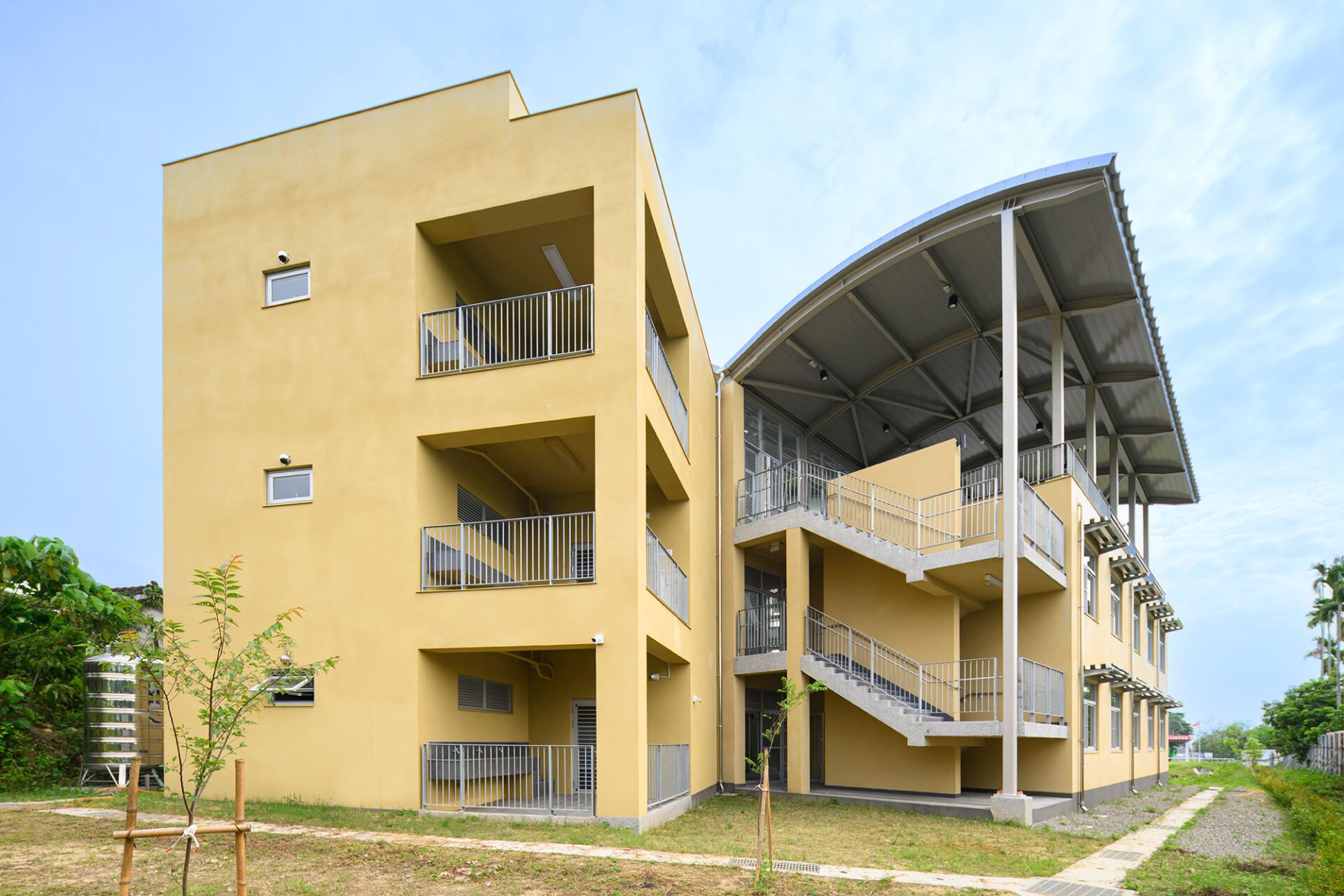 建築設計因應地塊南寬北窄之幾何特徵,配置東西兩條建築量體,呈現V字型,將開口面向西南方,引入夏季西南季風,幫助室內通風,提高室內物理環境舒適度,並降低建築能耗、綠色永續。東棟配置三層樓建築量體,包含宿舍間、樓電梯及浴廁空間,西棟配置兩層樓量體,包含宿舍間、康樂室及半戶外多功能曬衣平台,共計19間宿舍間,可容納共110名學生。外觀最具特色的非屬曲面造型的屋頂莫屬。屋頂的設計理念為大鵬展翅,由左右兩條曲線構成,搭配遠方山脈的風景,就如同一隻大鳥,從山中飛來。期許學生們,在這樣的空間中學習成長,最後也都能夠如同這隻大鳥,展翅高飛,帶著夢想走出校園,勇敢前行。