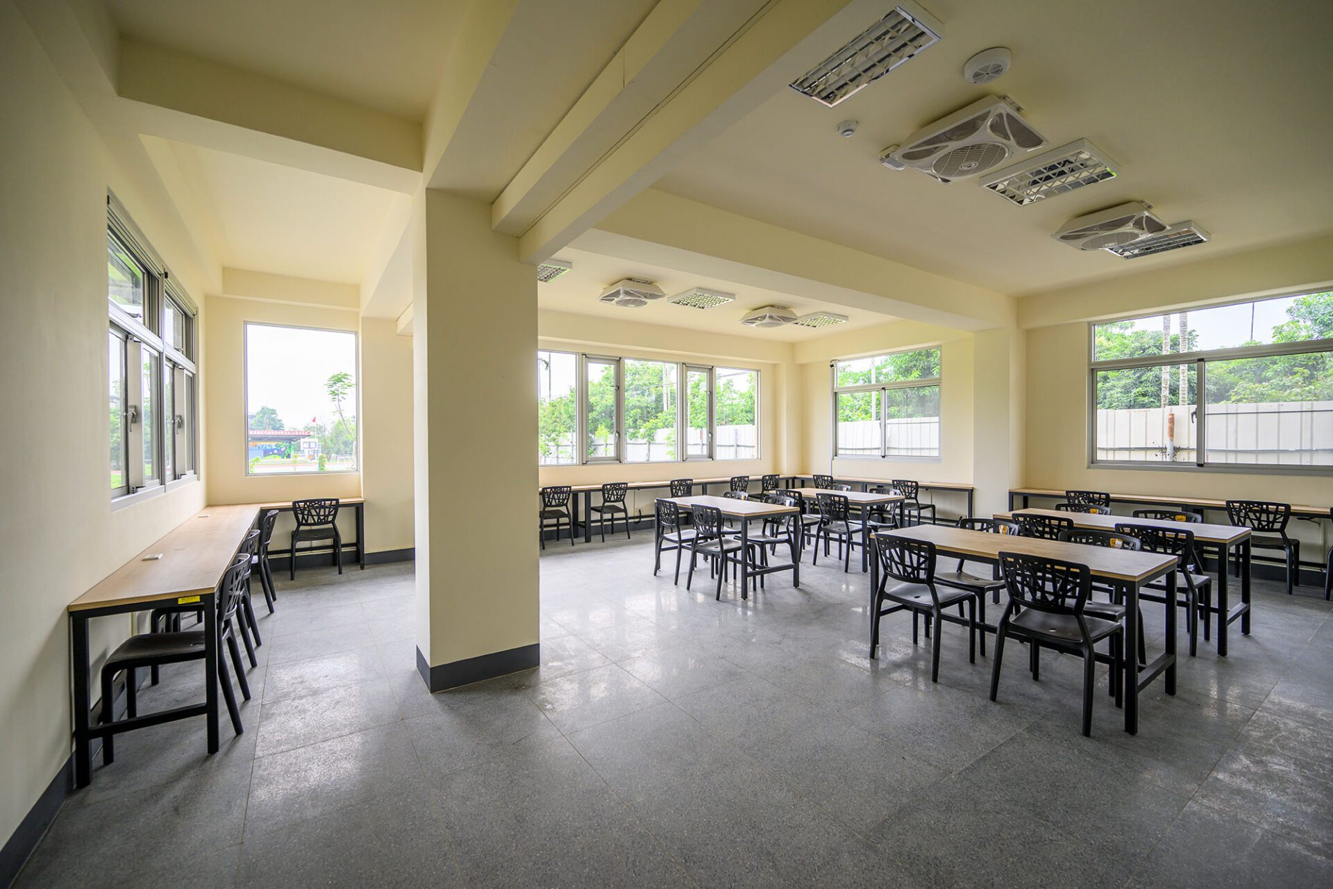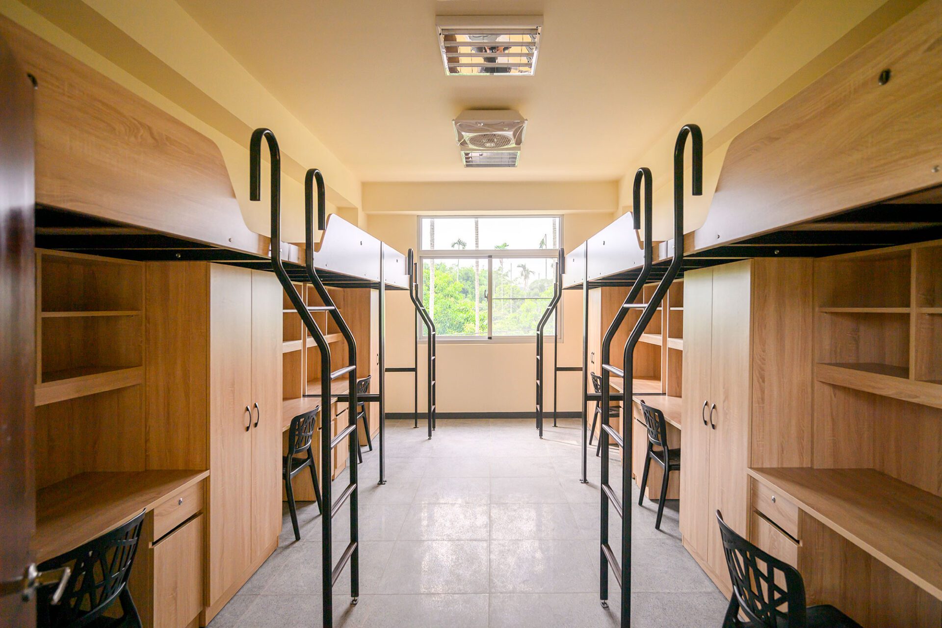 本案打破一般學生宿舍封閉呆版之設計模式,著重創造大量半戶外交流空間、室內公共空間,希望提供學生除了基本住宿需求外,有良好的交流互動平台,實現友善校園、健康生活的願景。於西棟三樓設置之半戶外曬衣平台,擁有三面開放的景色,往北看是中央山脈的美麗風景,往南看是多采多姿的校園生活。挑高的空間及深出簷,兼顧空間使用的靈活度、良好的通風及避免潑雨問題,提供學生晾曬棉被、衣物的空間需求,並可作為食宿教育活動的場地,舉辦小型團康或表演,增進學生間的情感及歸屬感,傳遞「家」的價值。兩棟樓間層層擴大的中庭空間,就是學生平時交流互動的最佳場所,這裡刻意營造上下聯通的中庭空間,打破層與層之間的屏障,讓不同班級、不同年級的學生有更多交流的機會。一樓靠近入口處,設置有一間康樂室,這裡提供學生自修、小組討論學習、團體活動娛樂等功能,大面的開窗將綠意引入室內,即便白天不開燈,都有非常良好的採光及通風效果,提供學生舒適的學習、休閒空間。